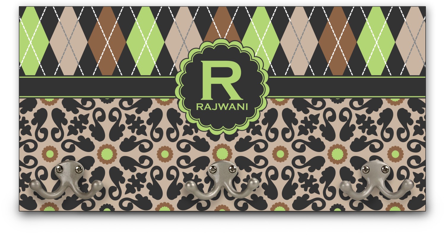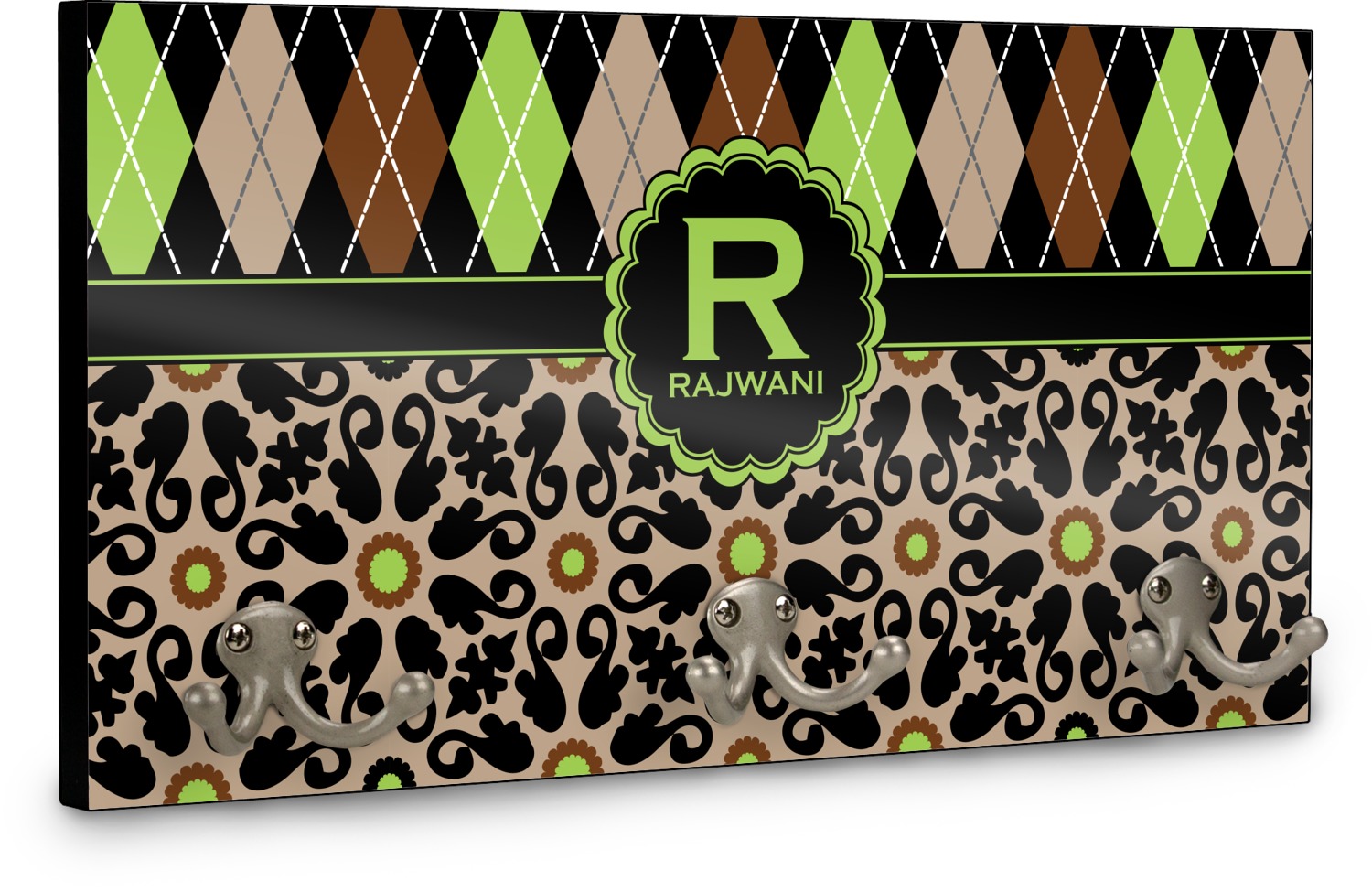 This coat rack is the perfect way to add some personality to your wall or entryway. The board is made of a strong maple that is approximately 16" x 8". The three 2-prong hooks are a sturdy metal that have three screws attaching them to the board. Your design is printed right onto the front of the board while the back and sides are a simple black.