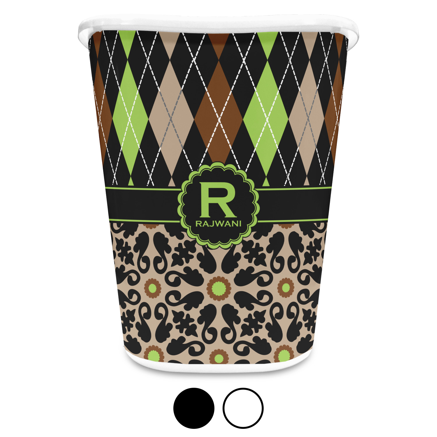 You can choose to purchase these decorative wastebaskets in either a white or a black color that will show on the base and the upper rim. Your customization is printed on a high-gloss, fine-quality vinyl adhesive, and you can choose to either have this adhesive applied to one side only or to both sides. As such, this plastic wastebasket can be single-sided or double-sided, depending on your creative vision. Your customization is printed using durable inks, making the design waterproof and resistant to fading over time.