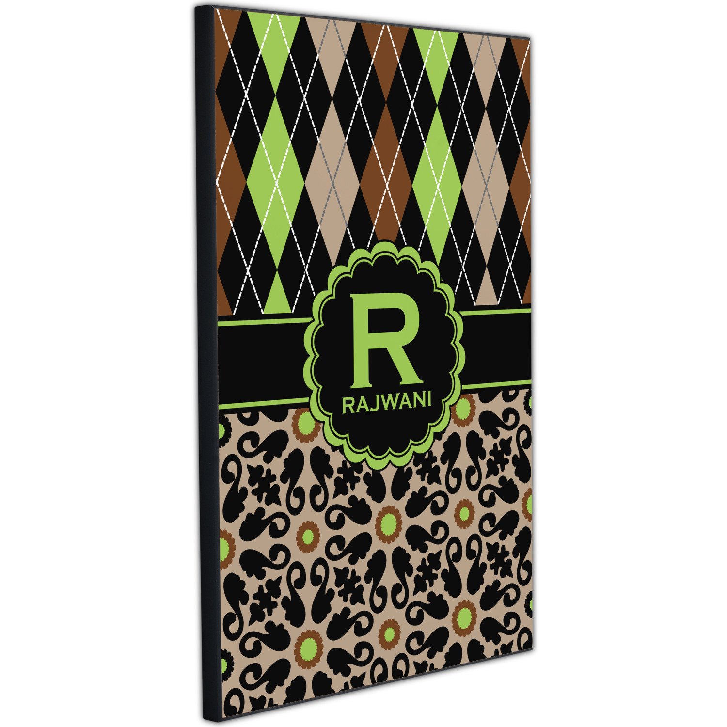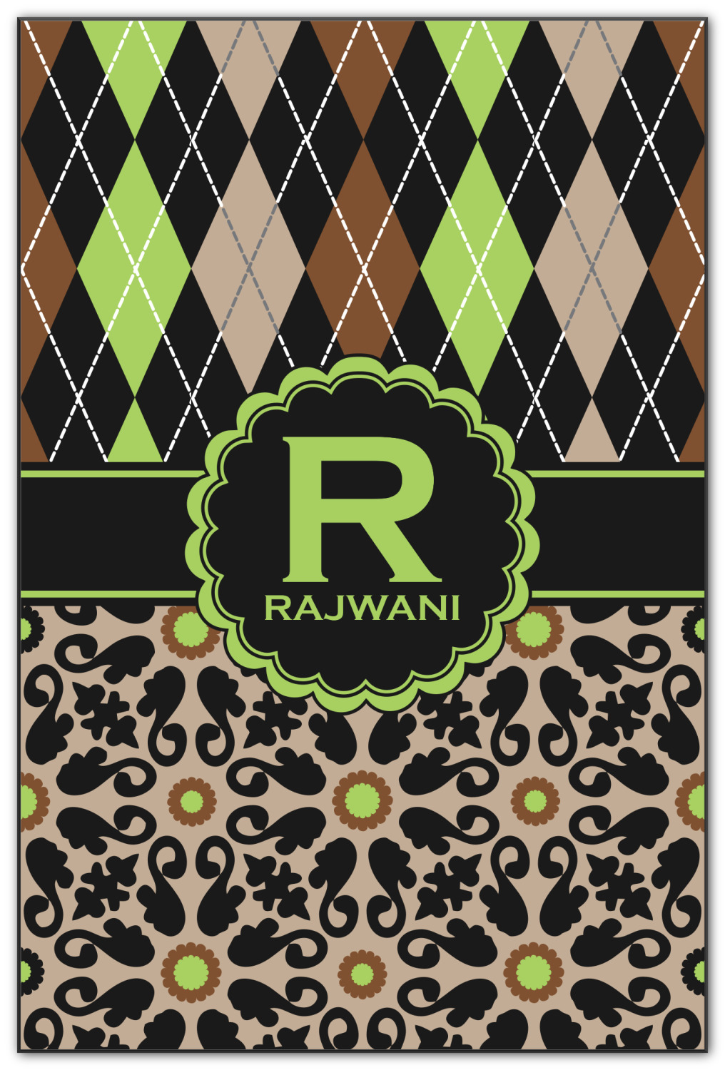 Feminine and masculine collide with this gorgeous design. The top of the design is a contrasting harlequin print in the colors of black, brown, tan, and lime green. The bottom of the design offers a fun girly flair in an abstract pattern in the same colors as the harlequin pattern set against a tan background to create a floral pattern