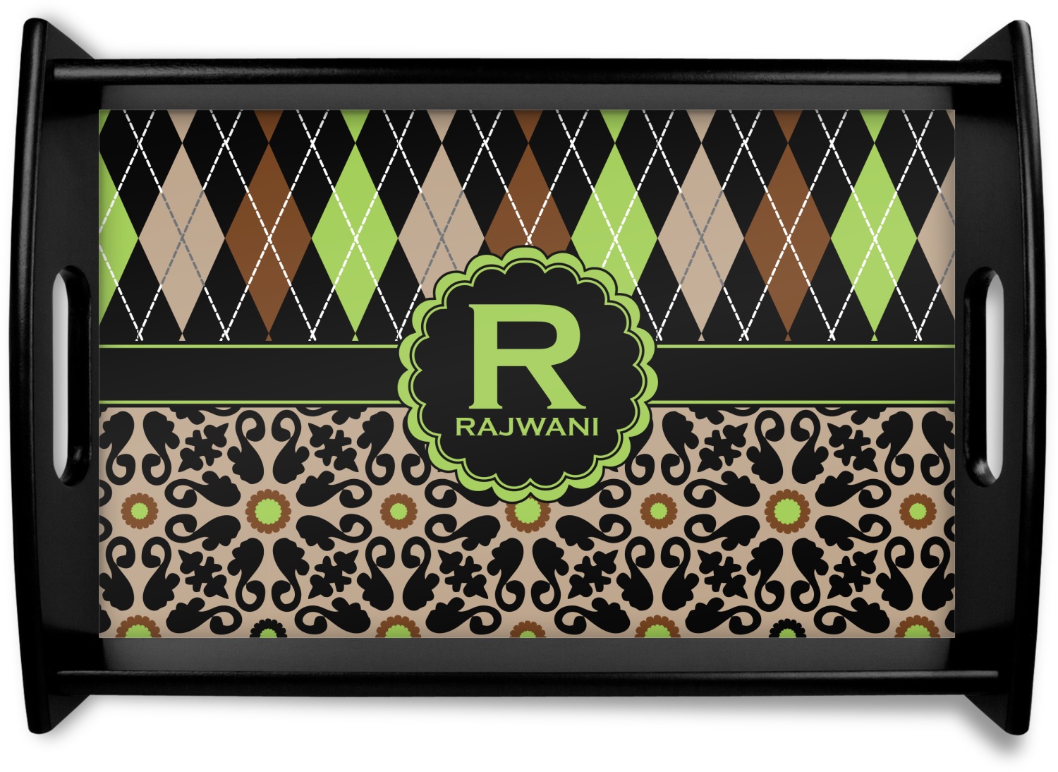 This serving tray with handles features square edges and two rounded sides, creating a very modern look. Each side is fabricated from a beautifully cut, natural wood. The bottom of the interior of the tray displays your customized design in bright, vibrant color. The tray is sold in both a black color and a natural wood look. Each variation of the wood serving tray has two sizes: Small, which is 14" x 10" x 2.25", and Large, which is 19.5" x 13.5" x 2.75".
