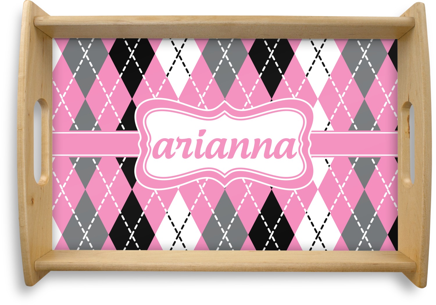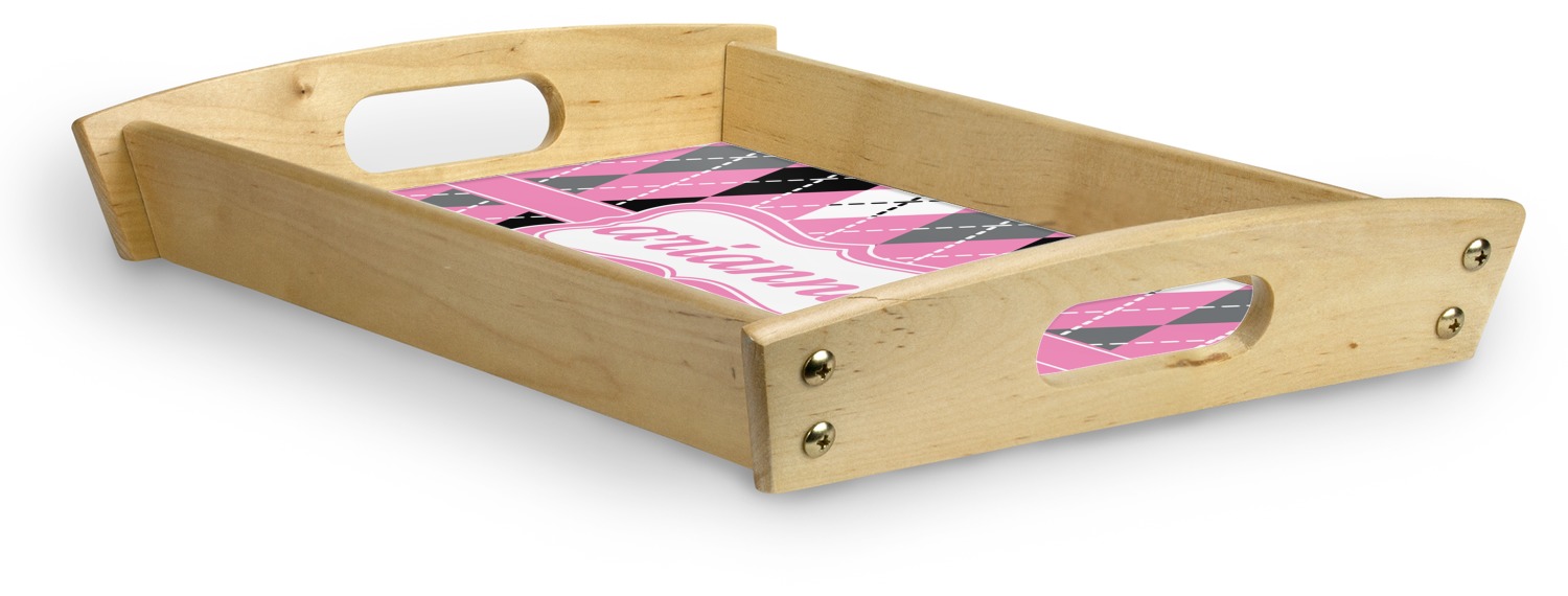 This serving tray with handles features square edges and two rounded sides, creating a very modern look. Each side is fabricated from a beautifully cut, natural wood. The bottom of the interior of the tray displays your customized design in bright, vibrant color. The tray is sold in both a black color and a natural wood look. Each variation of the wood serving tray has two sizes: Small, which is 14" x 10" x 2.25", and Large, which is 19.5" x 13.5" x 2.75".