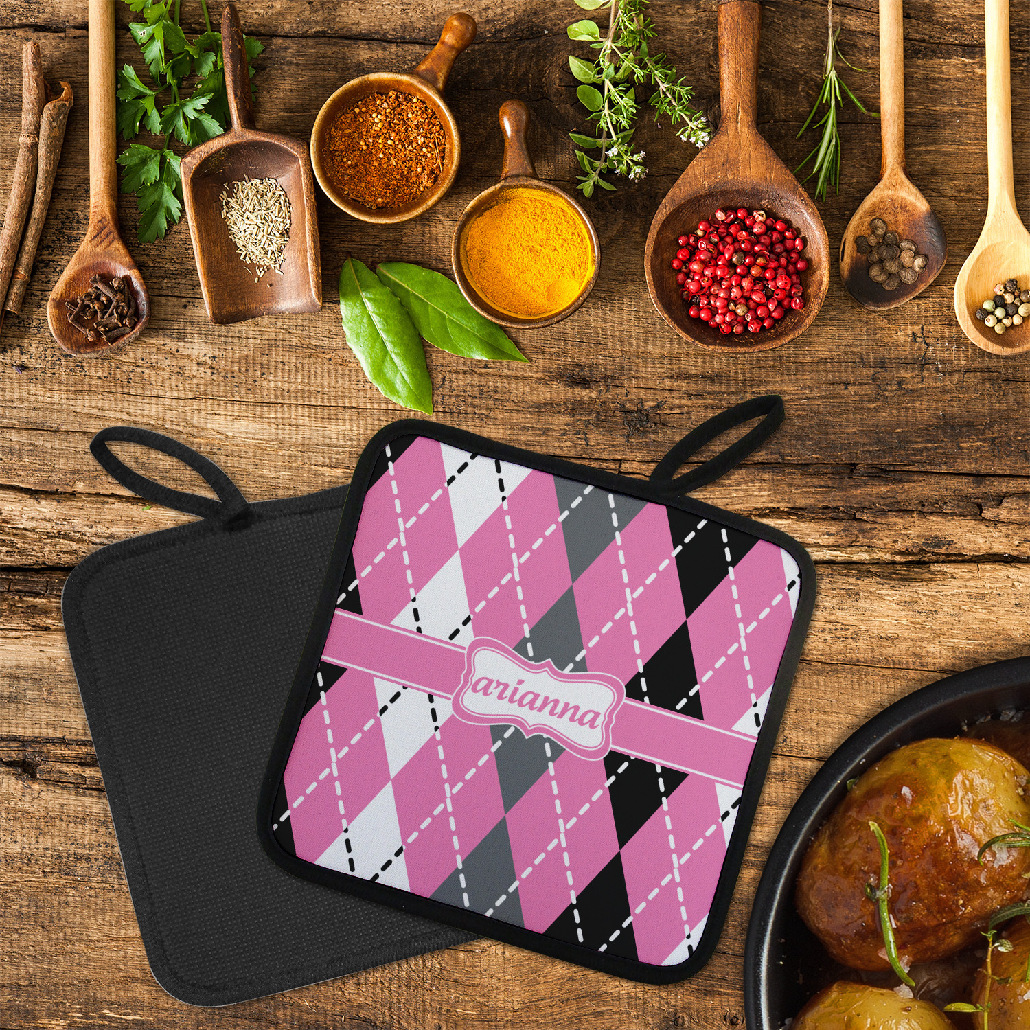 Our personalized pot holders feature a neoprene front that displays your personalization in vibrant colors. The backing of the hot pot holder is rubberized; the textured backing allows you to have a great grip when using this custom pot holder. The two materials are joined with a sleek, black trim, and the holder also includes an attached loop for hanging and storage. The pot holder is approximately 8.75 inches by 8.75 inches and 0.25 inches tall, while the fabric loop is 2.5 inches long. You can purchase a kitchen pot holder by itself or as a set of 2. We also offer a set including one pot holder and one oven mitt.