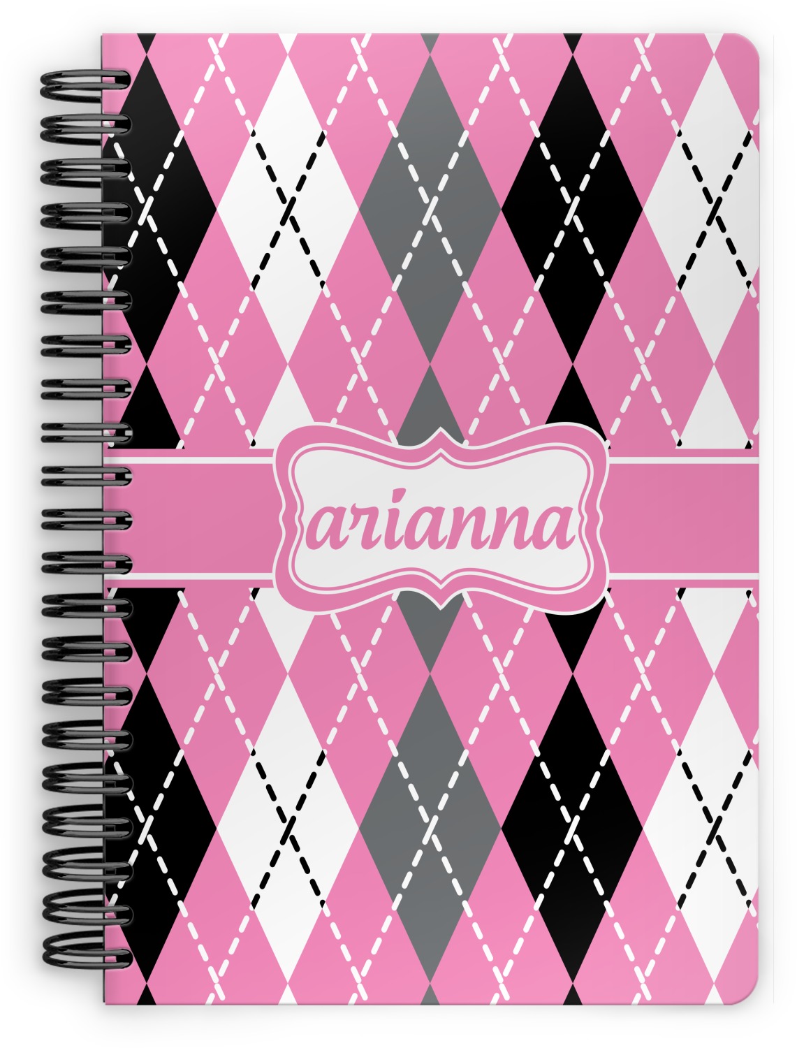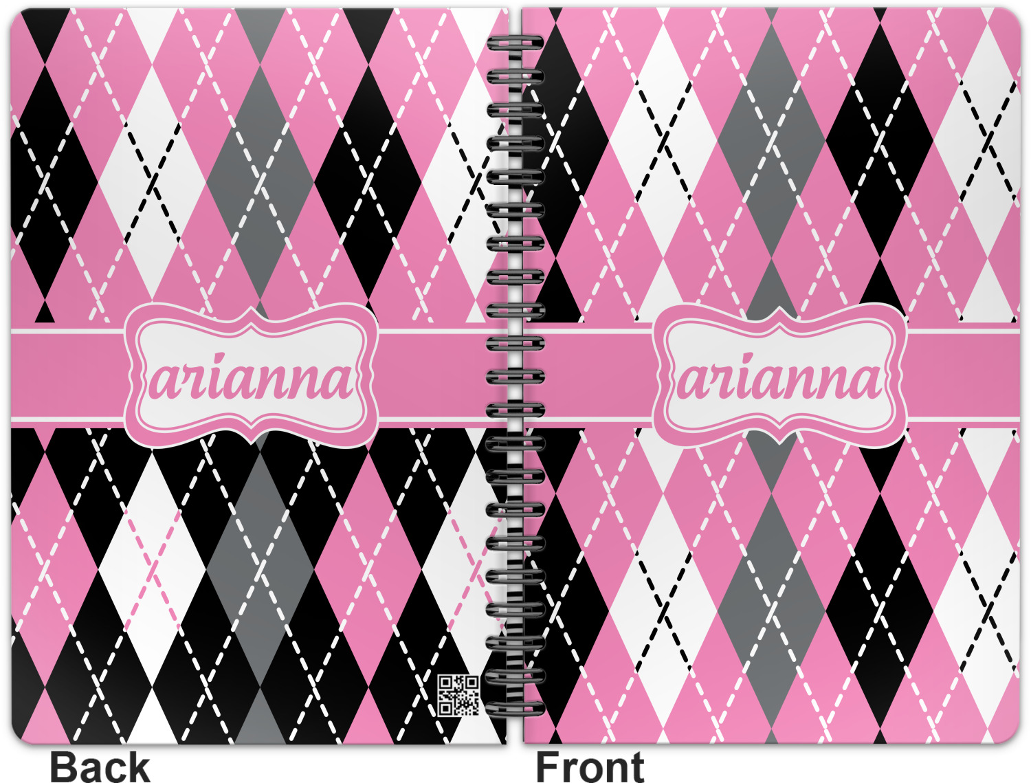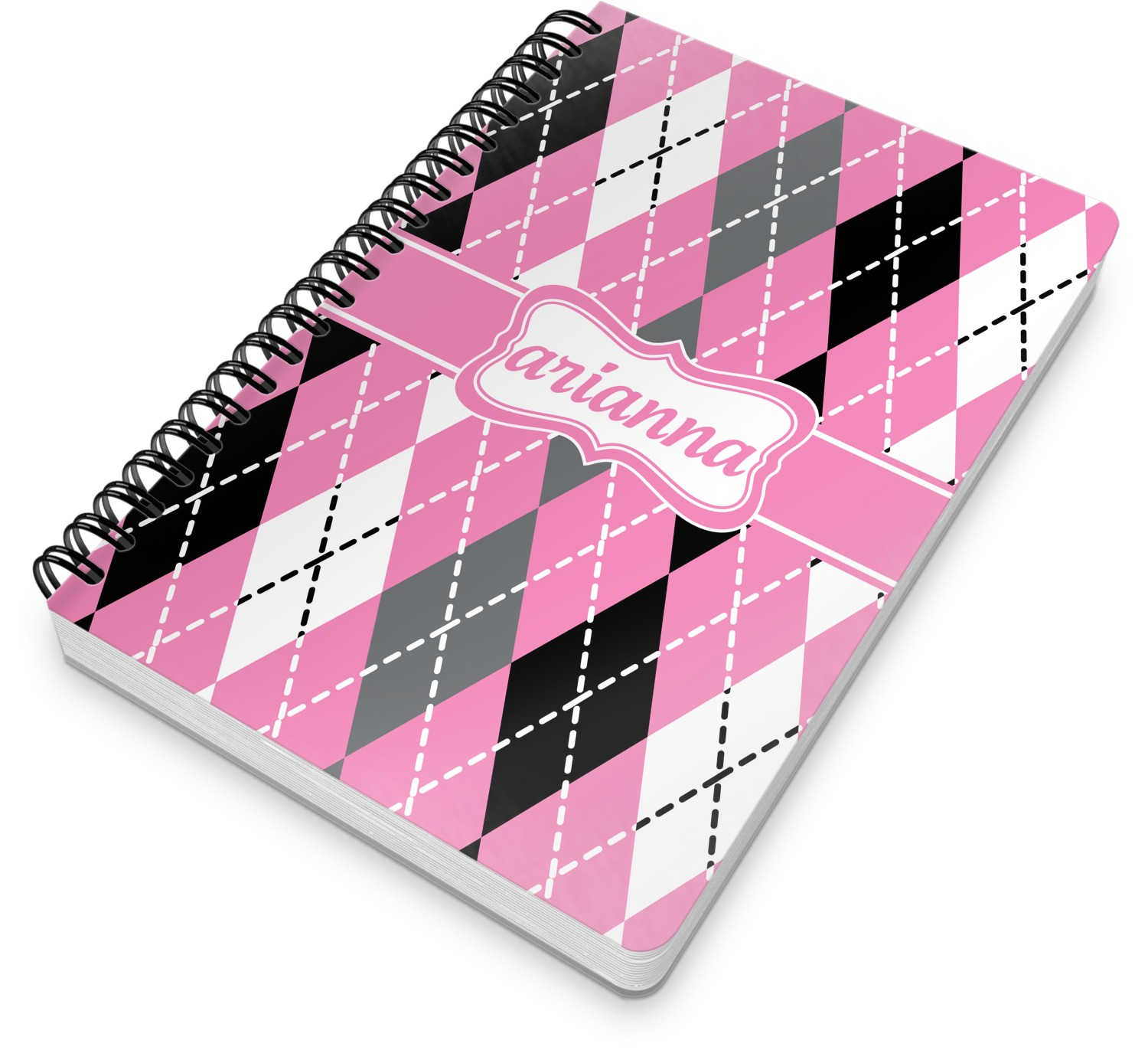 This spiral notebook includes 75 sheets of thick, ruled paper. The front and back of this custom notebook is made of a robust, laminate, plastic covering. We print your personalization on these two panels, underneath a glossy finish, which emphasizes the colors of your design. The two panels and the sheets of paper are held together by a sturdy, black coil. The paper within your bound notebook is perforated for easy, clean tearing.