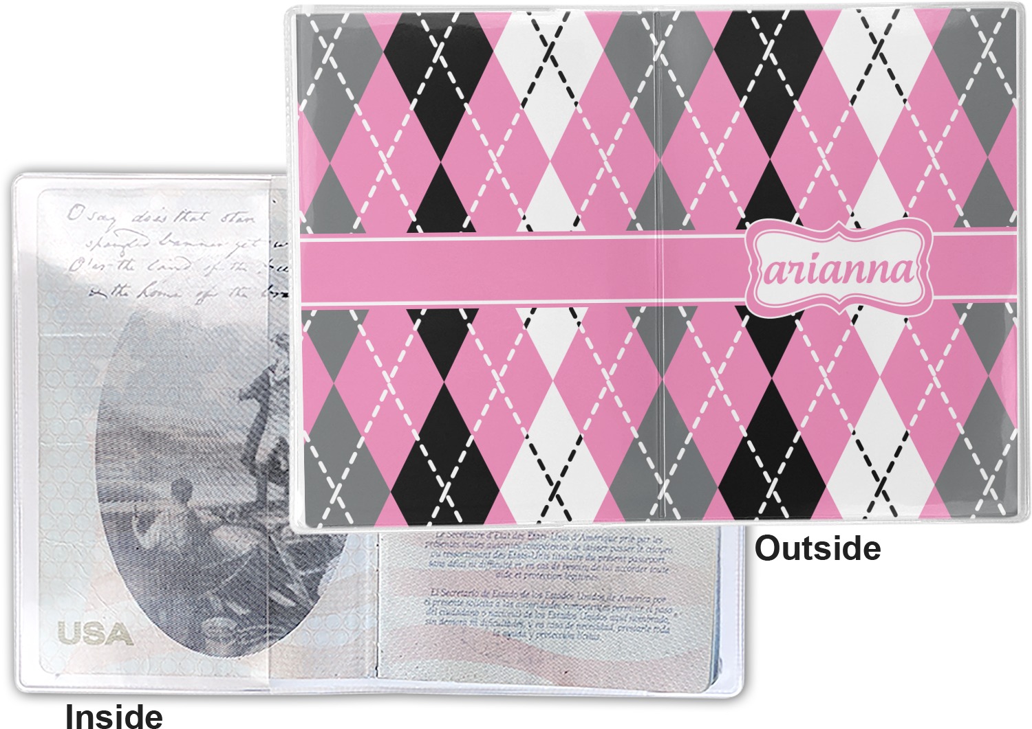 This cover is made of a sturdy clear vinyl with a personalized vinyl insert inside. There is a large and a small pocket on either side to hold the covers of your passport easily and firmly. The passport holder is approximately 7.5" x 5.25", the perfect size to snugly fit your passport. This slim cover is the perfect way to protect your passport without being one more bulky item you have to carry.