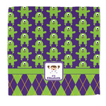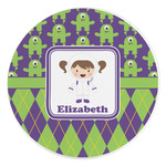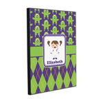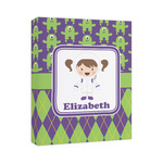 The center focal point of the design is a white square label outlined in the coordinating green and purple colors with our cute little girl in the middle. Add your little girl's name to make this design extra special.