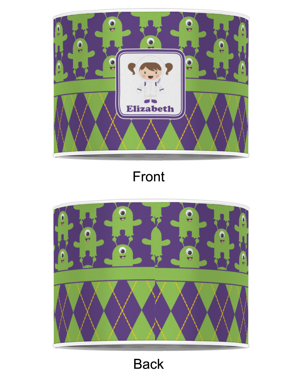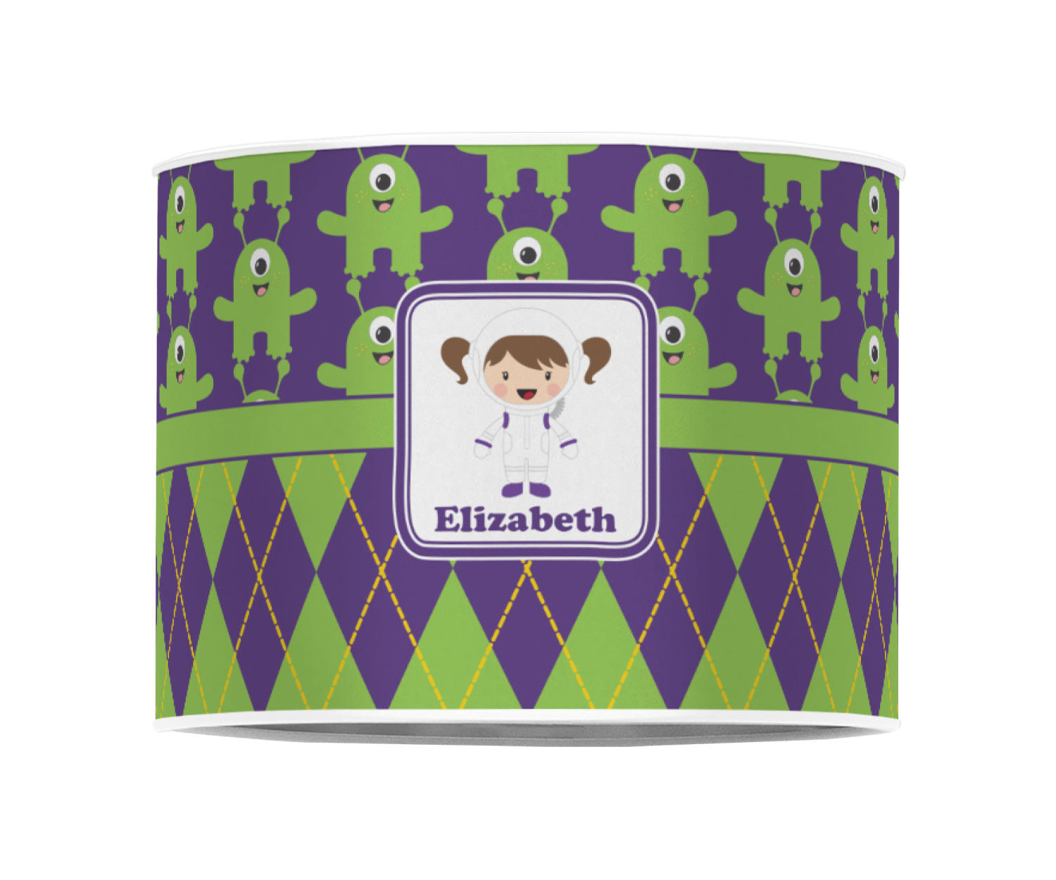 Not all martians have to be scary. These adorable green, one eyed martians will make any little girl a space fan. These little green martians come to life up against these beautiful purple background. The bottom of the design is a timeless green and purple argyle pattern with yellow accents. A green band with a purple trim brings both patterns together.