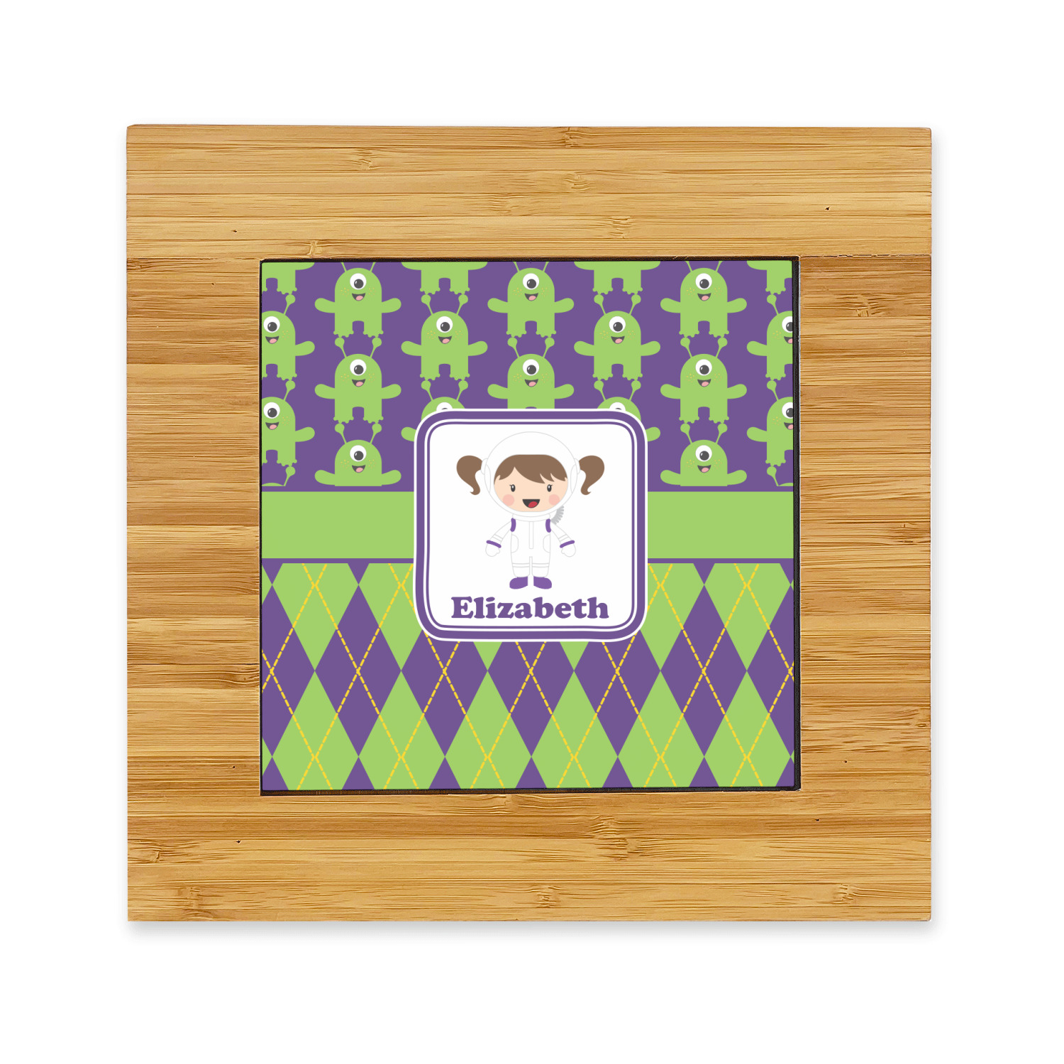 The center focal point of the design is a white square label outlined in the coordinating green and purple colors with our cute little girl in the middle. Add your little girl's name to make this design extra special.