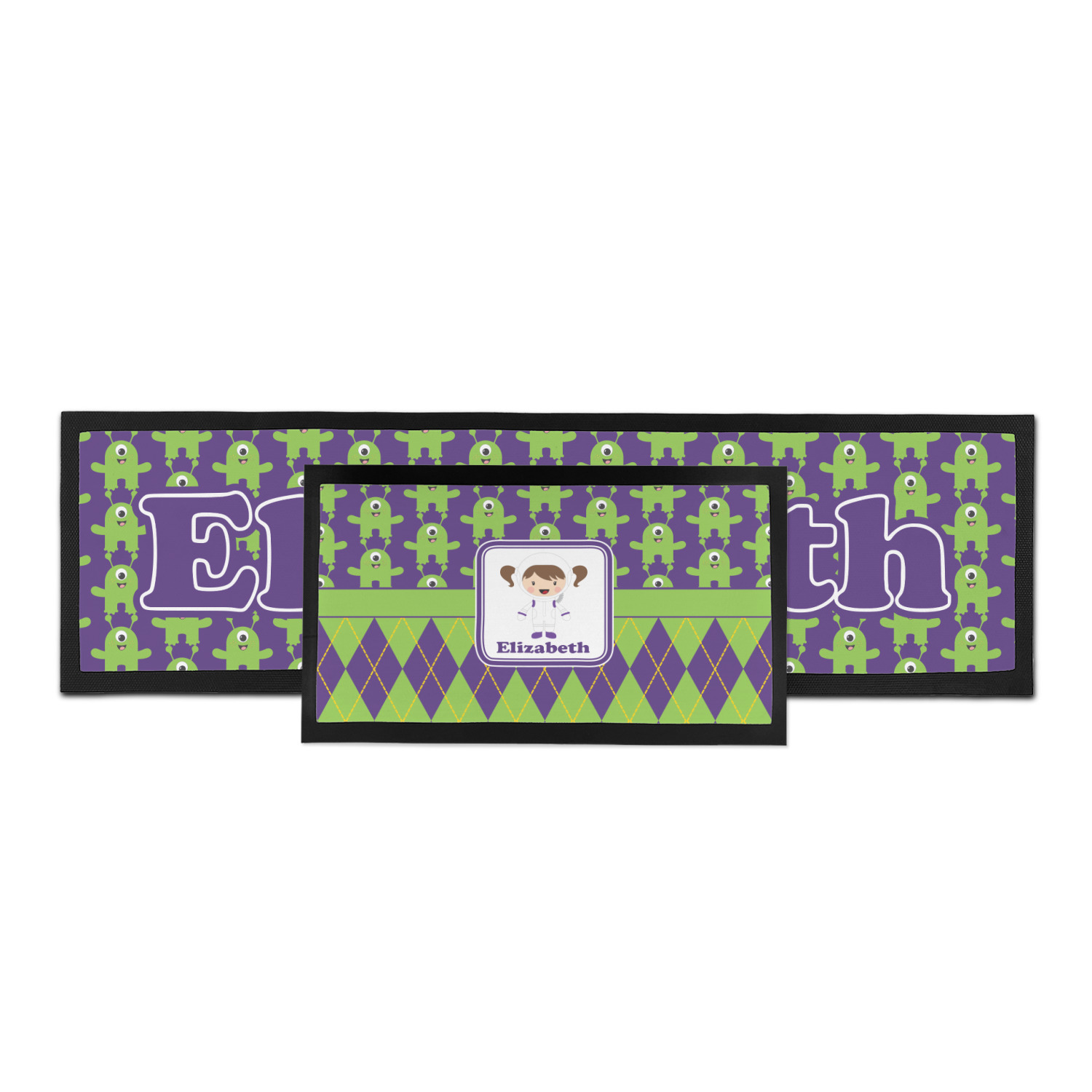 The center focal point of the design is a white square label outlined in the coordinating green and purple colors with our cute little girl in the middle. Add your little girl's name to make this design extra special.