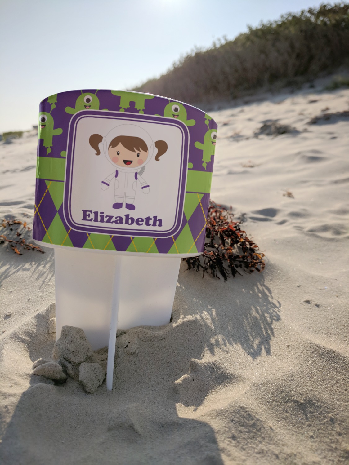 This cup holder has a large stake at its bottom that anchors it to the sand or ground below, while the cup holder rests above the stake. The entire drink holder is made of durable plastic and displays your customization around the cup holder portion. We sell these personalized beach spikers in two different colors: black and white.