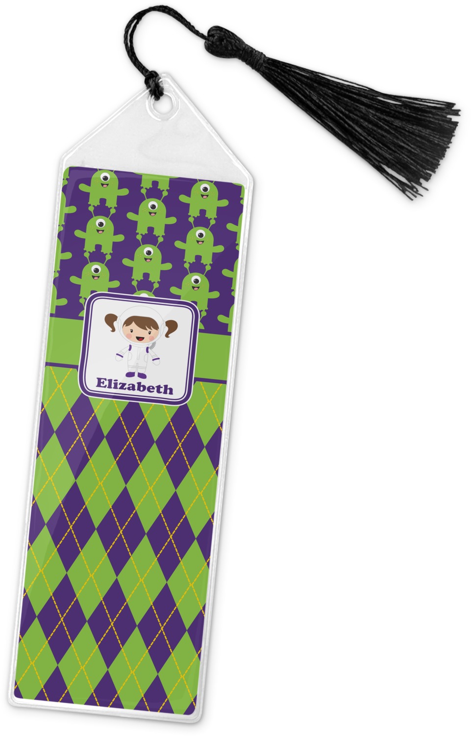 Your personalized bookmark is made of a sturdy, clear vinyl, and is approximately 7.5" x 2.25". We display your personalization on vinyl inserts that are placed on both sides. Accompanying each book marker is a black, fringe tassel that attaches to the reinforced, triangular header.