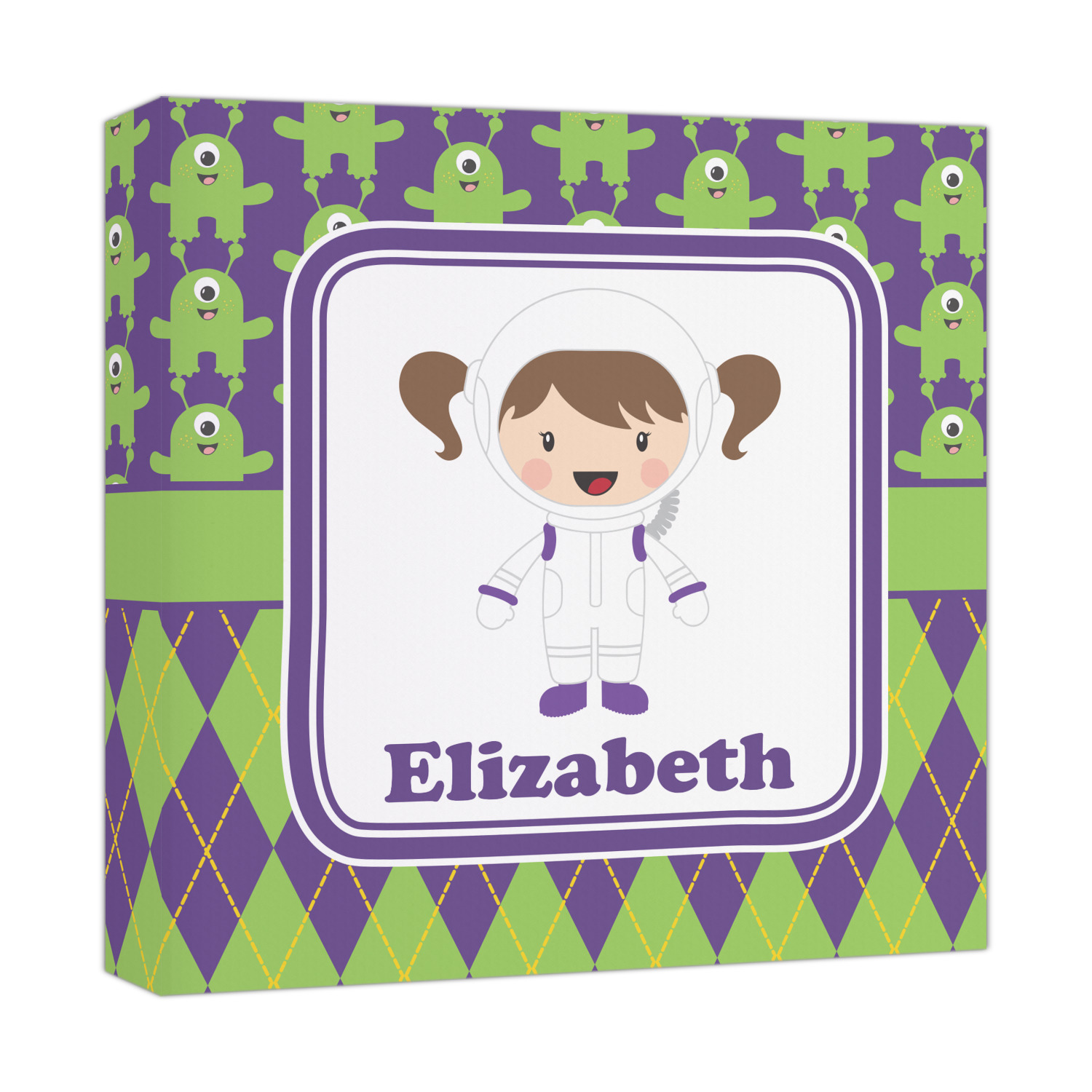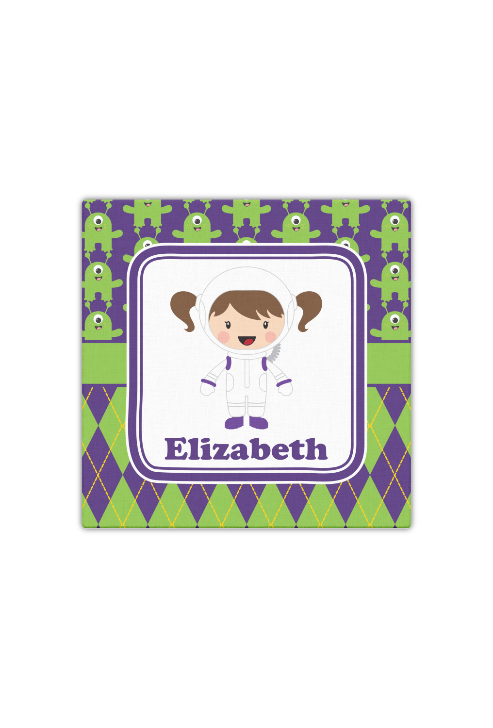The center focal point of the design is a white square label outlined in the coordinating green and purple colors with our cute little girl in the middle. Add your little girl's name to make this design extra special.