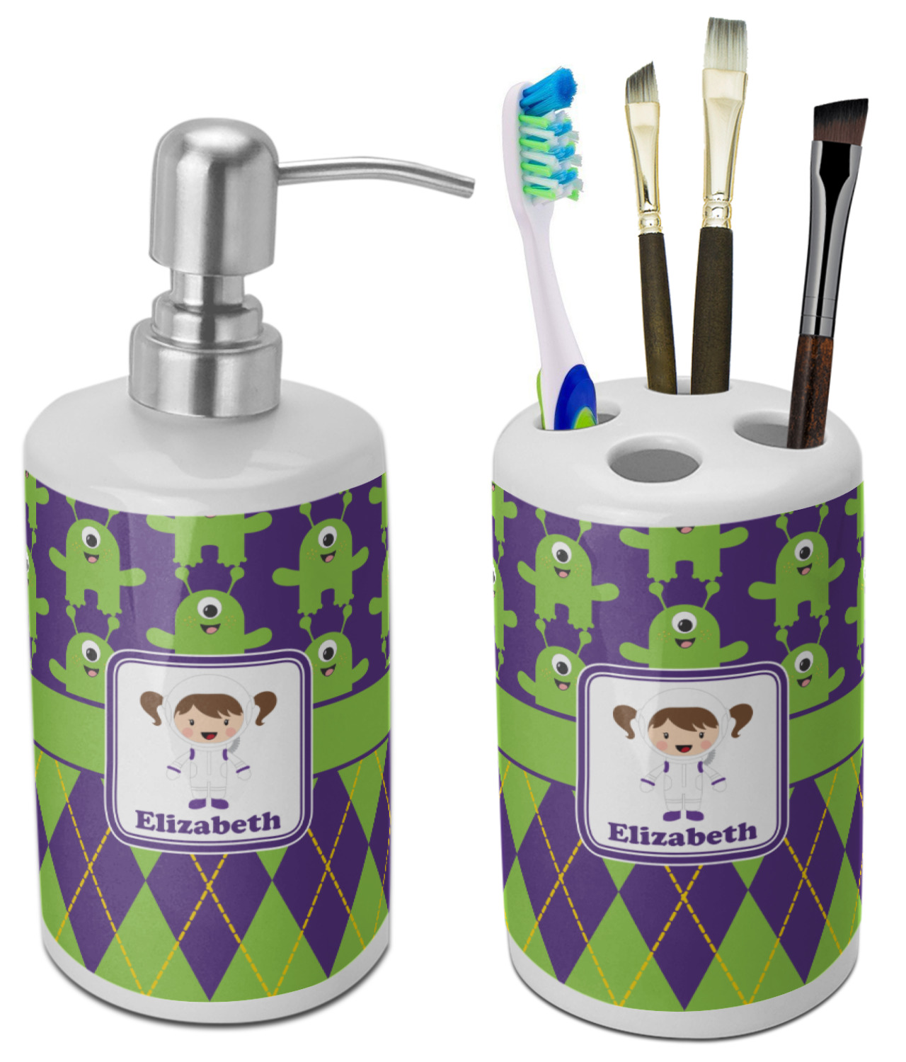 Not all martians have to be scary. These adorable green, one eyed martians will make any little girl a space fan. These little green martians come to life up against these beautiful purple background. The bottom of the design is a timeless green and purple argyle pattern with yellow accents. A green band with a purple trim brings both patterns together.