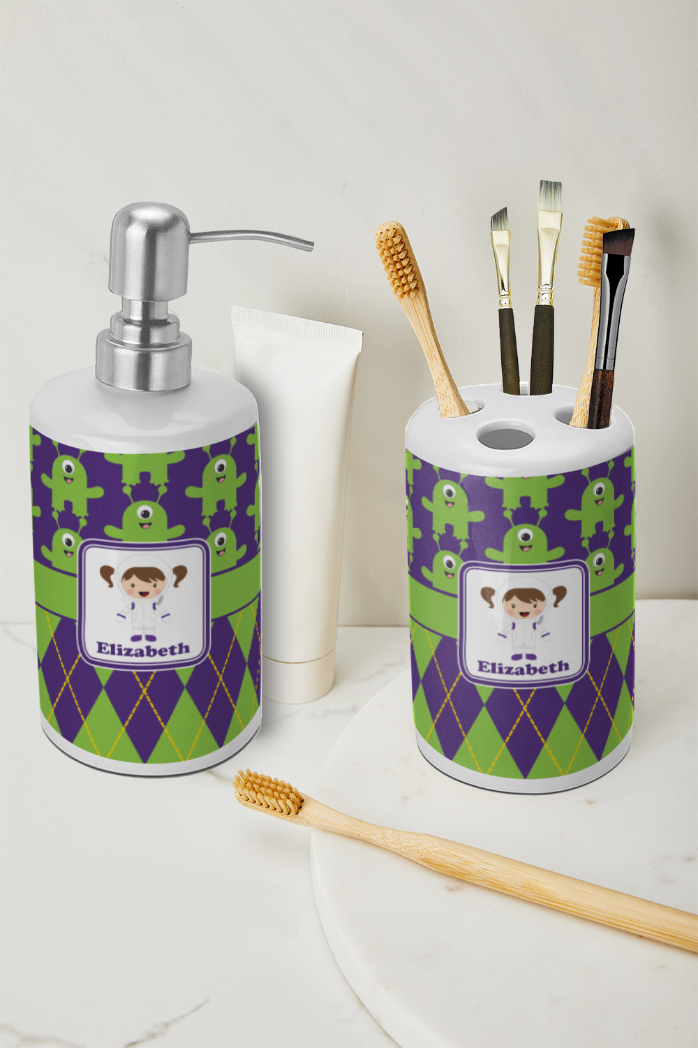This set can be personalized with a design, name or monogram or both. You can change the color and front until its especially and perfectly your own. Order two and create a his and her.