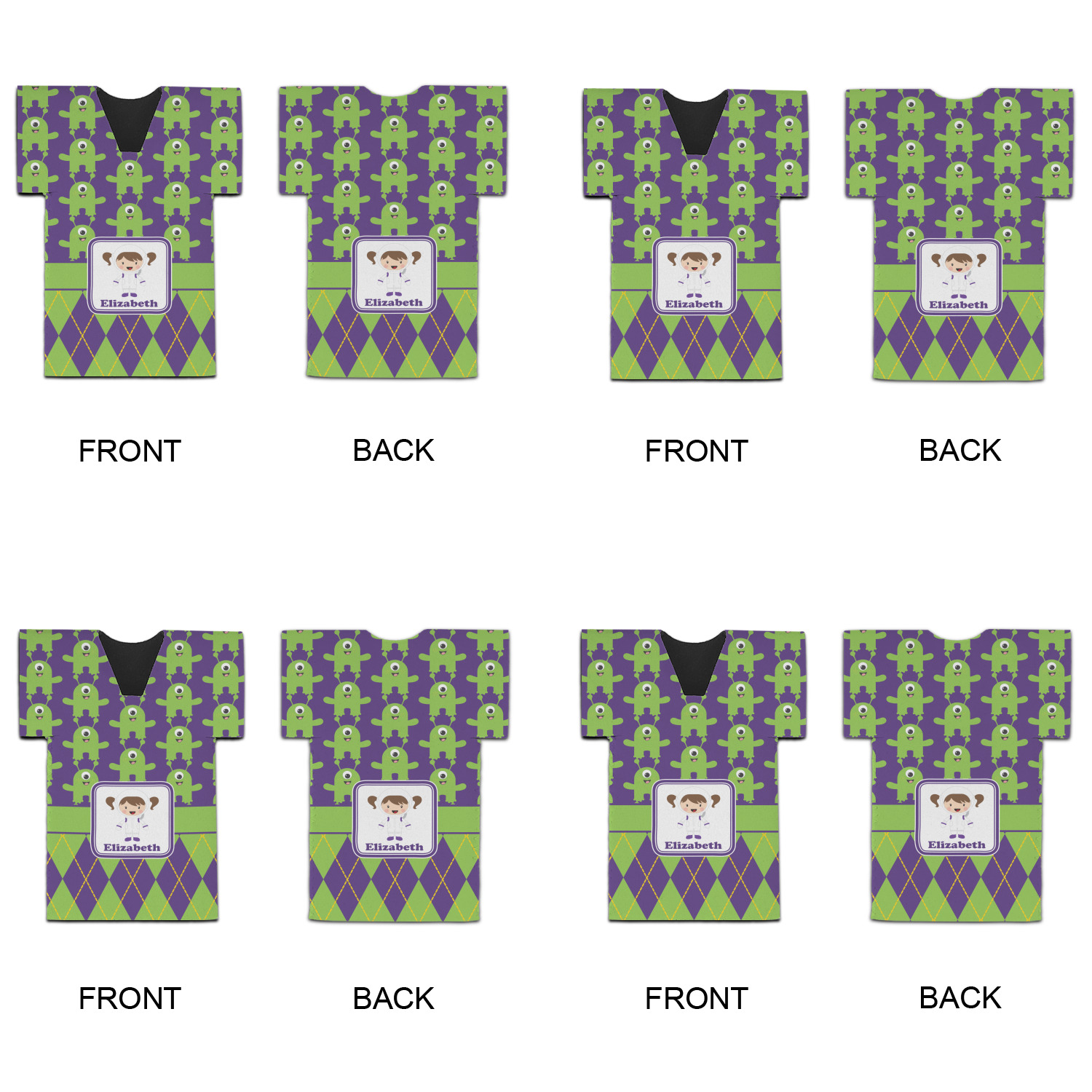 The center focal point of the design is a white square label outlined in the coordinating green and purple colors with our cute little girl in the middle. Add your little girl's name to make this design extra special.
