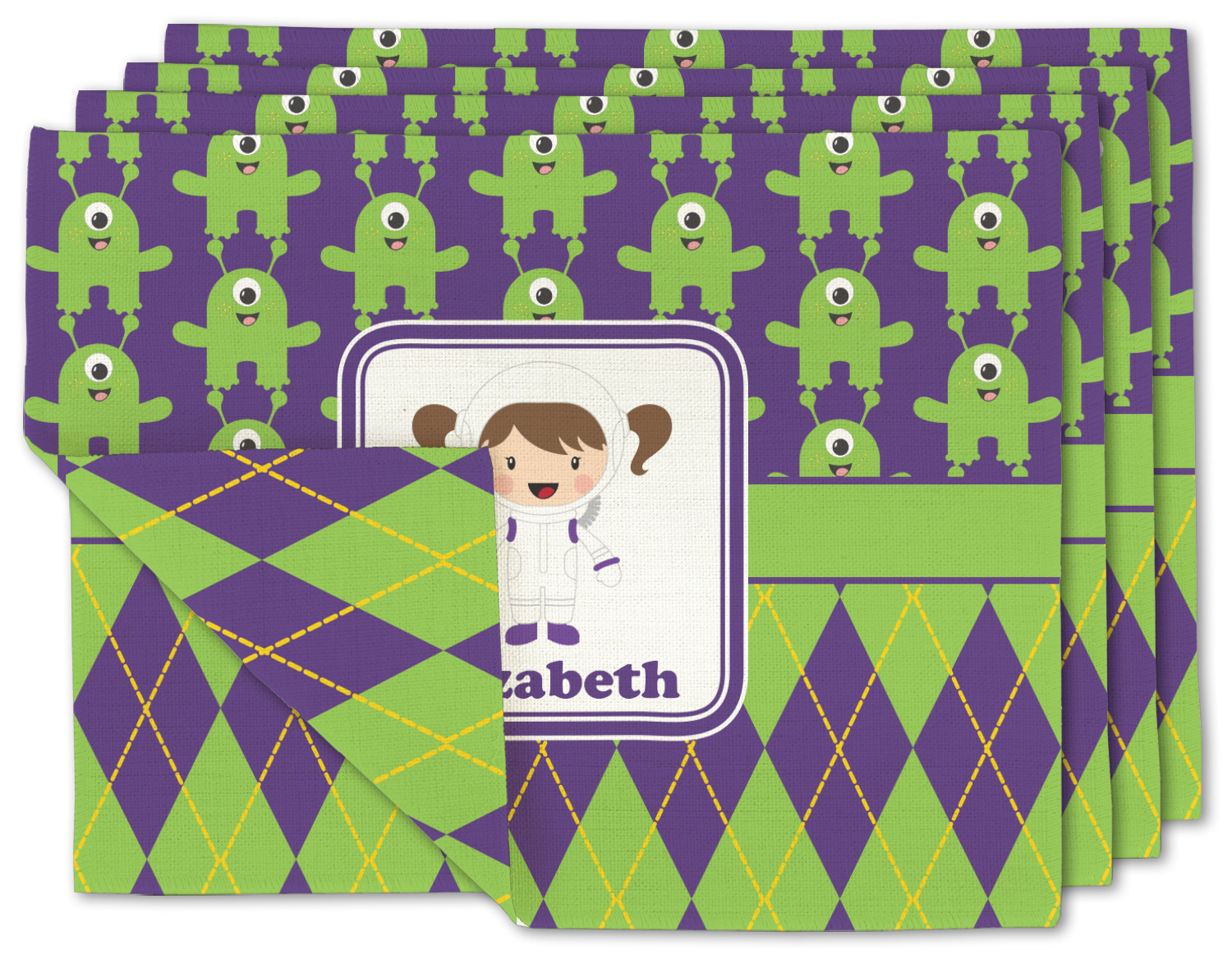 Not all martians have to be scary. These adorable green, one eyed martians will make any little girl a space fan. These little green martians come to life up against these beautiful purple background. The bottom of the design is a timeless green and purple argyle pattern with yellow accents. A green band with a purple trim brings both patterns together.