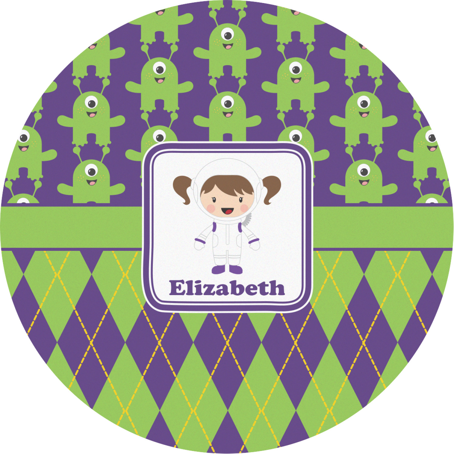 Not all martians have to be scary. These adorable green, one eyed martians will make any little girl a space fan. These little green martians come to life up against these beautiful purple background. The bottom of the design is a timeless green and purple argyle pattern with yellow accents. A green band with a purple trim brings both patterns together.