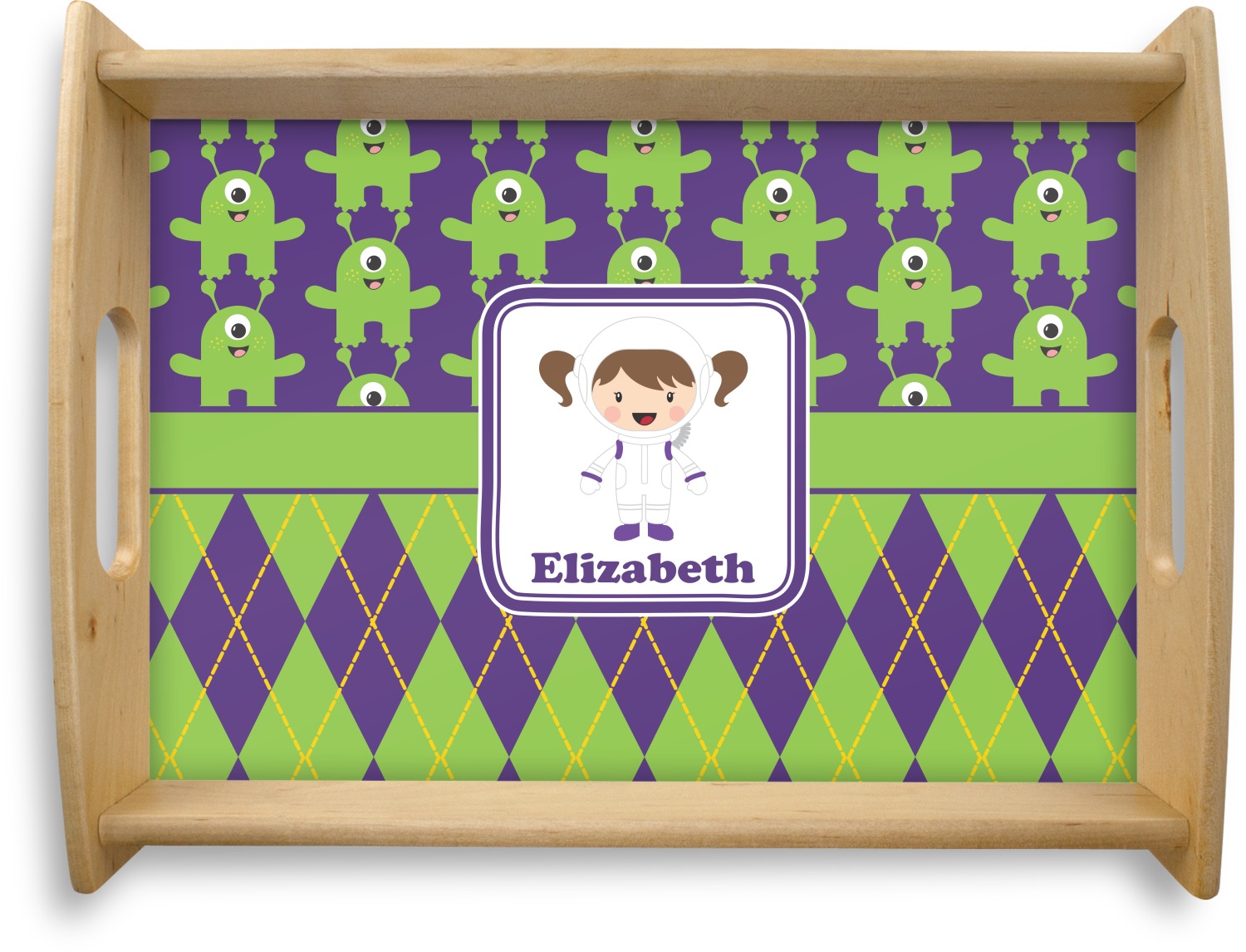 This serving tray with handles features square edges and two rounded sides, creating a very modern look. Each side is fabricated from a beautifully cut, natural wood. The bottom of the interior of the tray displays your customized design in bright, vibrant color. The tray is sold in both a black color and a natural wood look. Each variation of the wood serving tray has two sizes: Small, which is 14" x 10" x 2.25", and Large, which is 19.5" x 13.5" x 2.75".