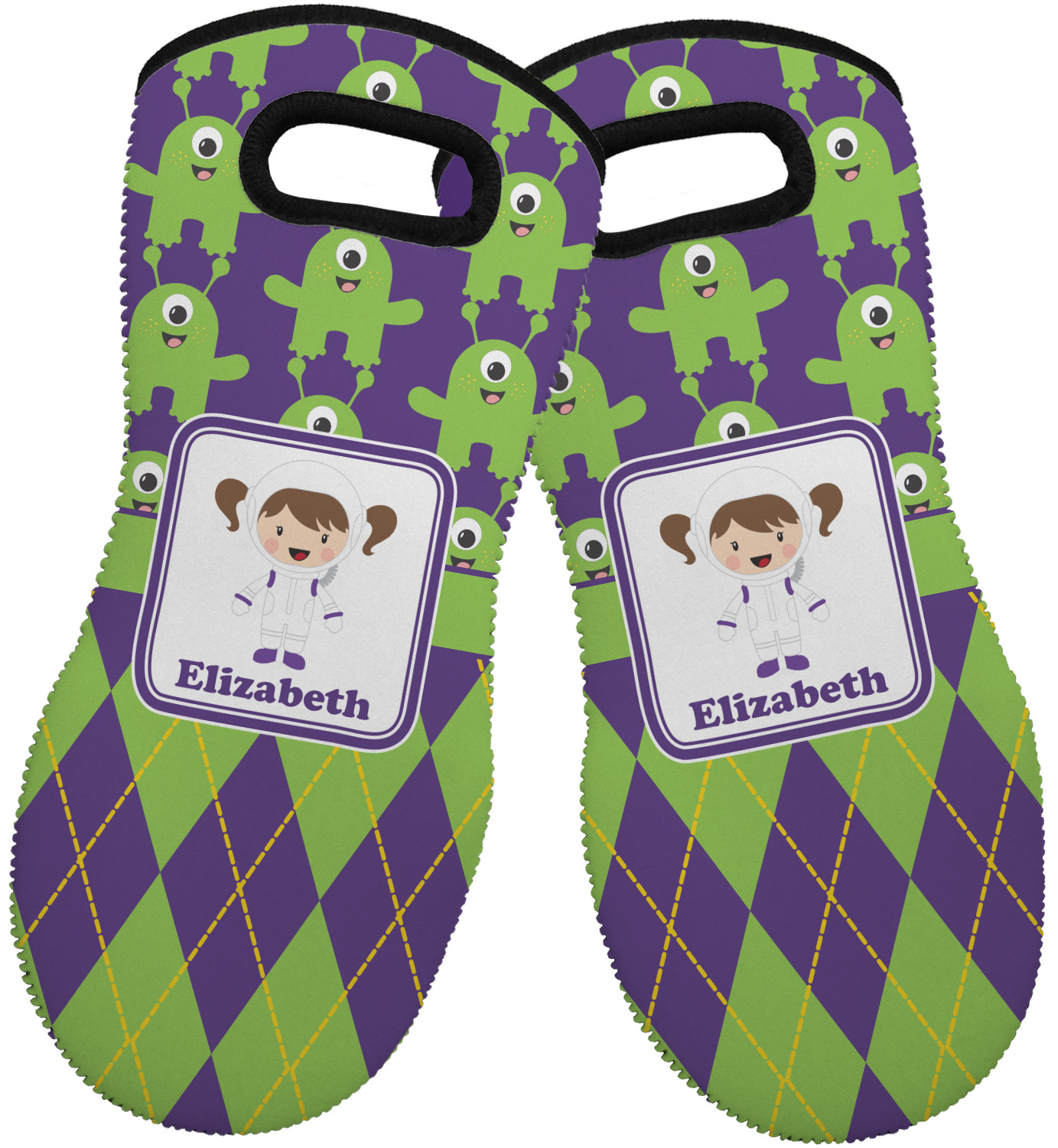 These heat resistant gloves are made entirely of a durable neoprene; the front features a softer texture, while the palm's side has a textured surface, meant to handle heat up to 500 degrees Fahrenheit. Thick, heavy duty stitching connects the two sides. A small, oval cutout appears on the front, and can be used to hang and store the mitt. Your personalization appears on the front, and the upper part of the back of the mitt. The style of these oven mitts are suitable for both the right and left hand, depending on your needs. If you need one for each hand, be sure to order two!
