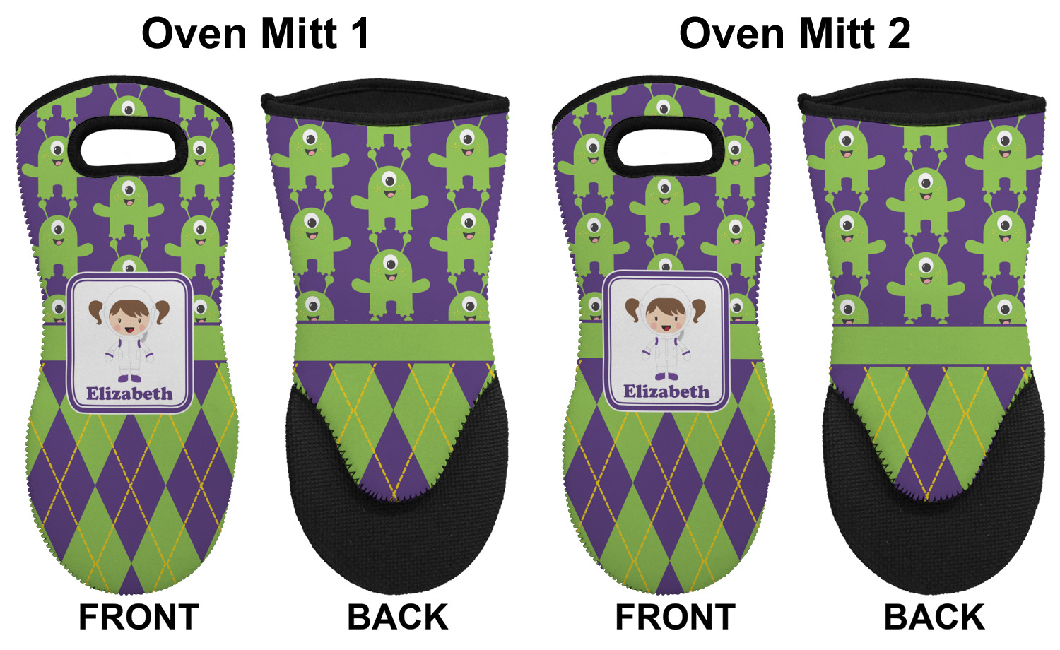 These heat resistant gloves are made entirely of a durable neoprene; the front features a softer texture, while the palm's side has a textured surface, meant to handle heat up to 500 degrees Fahrenheit. Thick, heavy duty stitching connects the two sides. A small, oval cutout appears on the front, and can be used to hang and store the mitt. Your personalization appears on the front, and the upper part of the back of the mitt. The style of these oven mitts are suitable for both the right and left hand, depending on your needs. If you need one for each hand, be sure to order two!