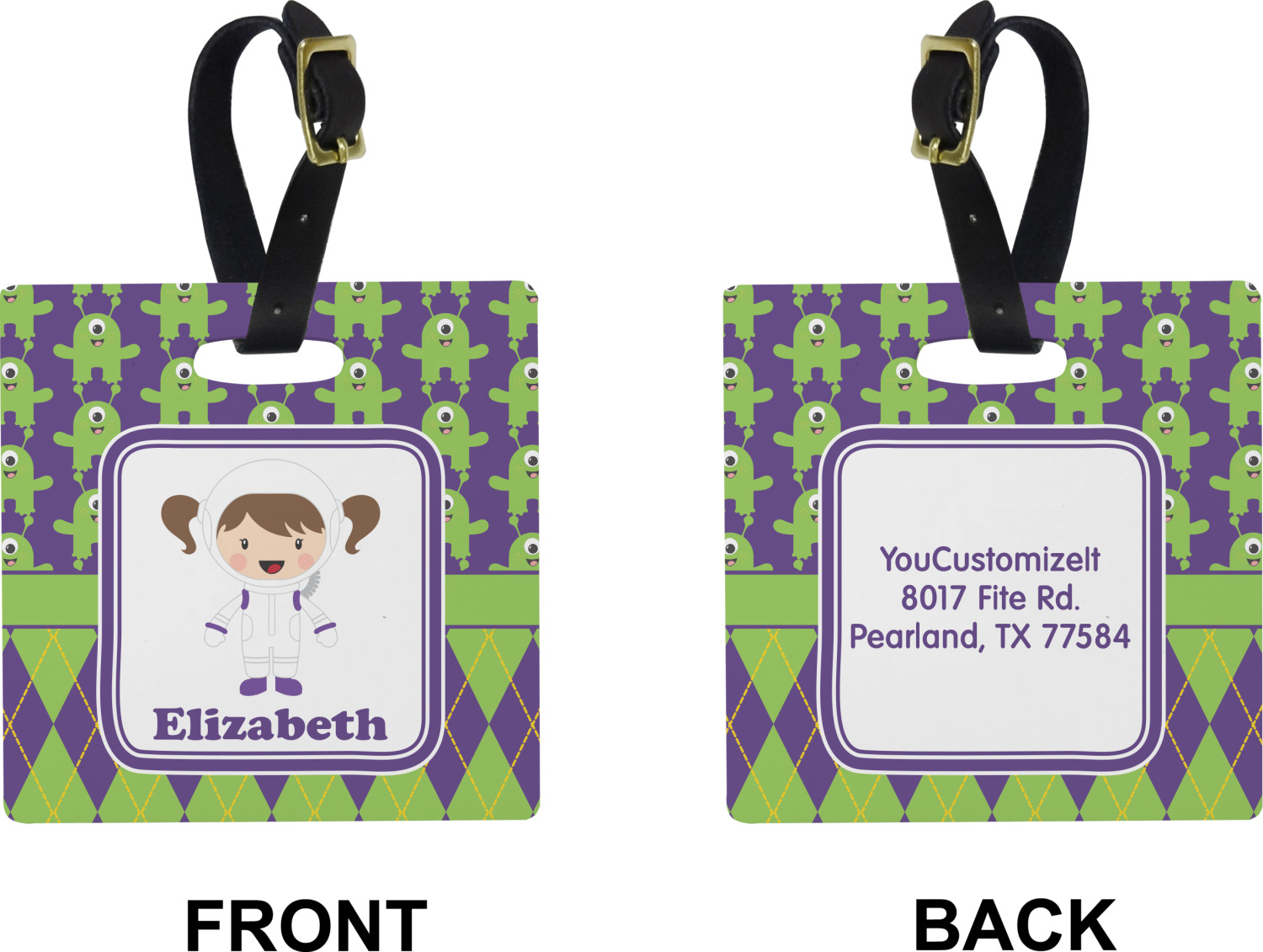 These personalized bag tags are sold in a variety of shapes, so that you may find the product that meets your vision exactly. We sell a round luggage tag, which measures at approximately 4" x 4". Our square luggage tag is about 3.5" x 3.5", while our rectangular version is 2.75" x 4 ".