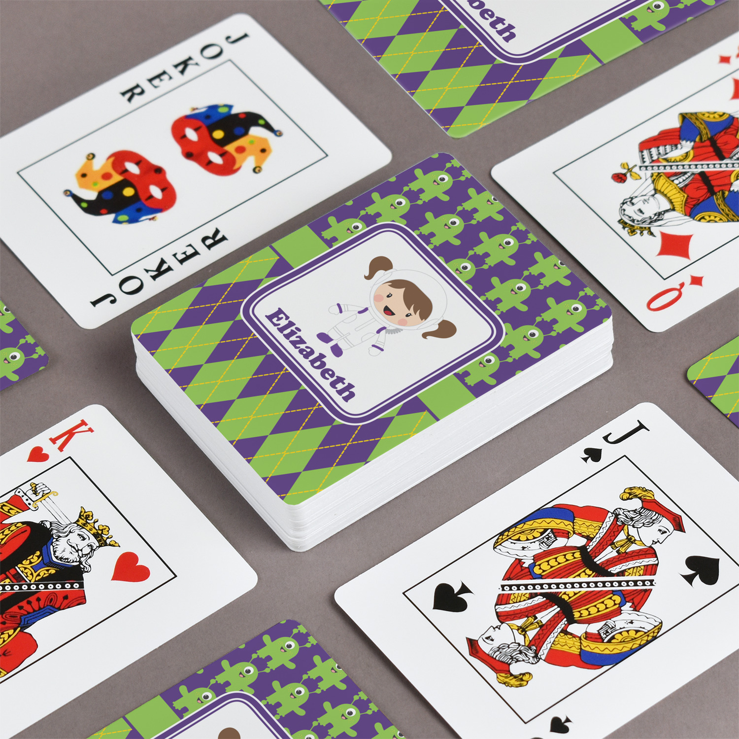 Our playing cards are perfect for family game nights or poker nights. A deck of customized playing cards ups the level of fun & entertainment to your game or poker nights. Imagine playing cards customized to match the theme of your game room, or game night, or that special event, or occasion with gambling tables!