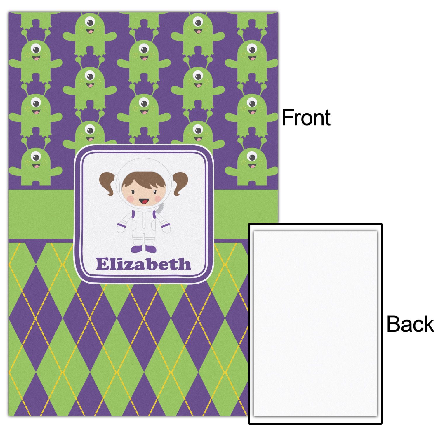 The center focal point of the design is a white square label outlined in the coordinating green and purple colors with our cute little girl in the middle. Add your little girl's name to make this design extra special.