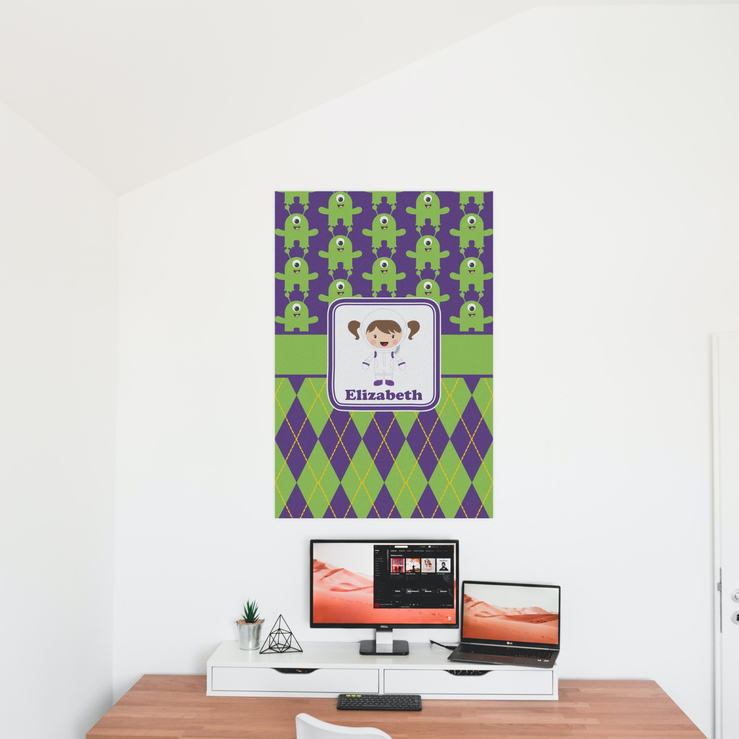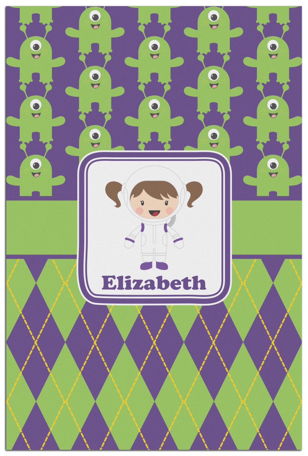 Not all martians have to be scary. These adorable green, one eyed martians will make any little girl a space fan. These little green martians come to life up against these beautiful purple background. The bottom of the design is a timeless green and purple argyle pattern with yellow accents. A green band with a purple trim brings both patterns together.