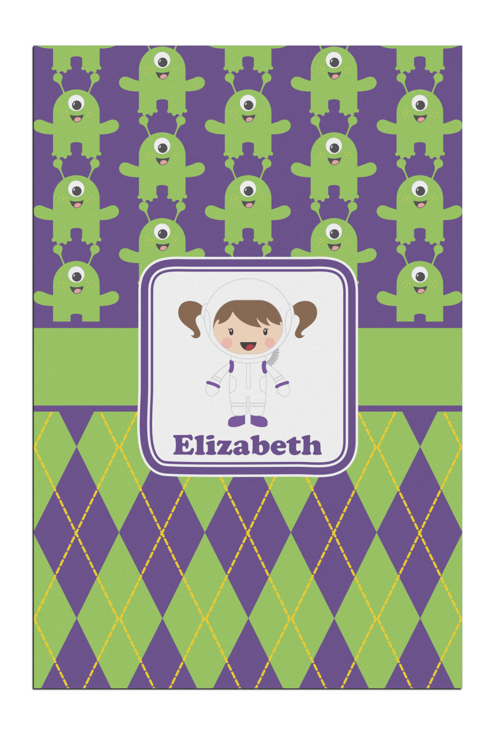 Not all martians have to be scary. These adorable green, one eyed martians will make any little girl a space fan. These little green martians come to life up against these beautiful purple background. The bottom of the design is a timeless green and purple argyle pattern with yellow accents. A green band with a purple trim brings both patterns together.