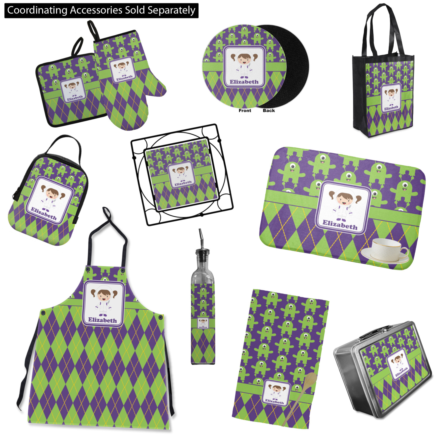 The center focal point of the design is a white square label outlined in the coordinating green and purple colors with our cute little girl in the middle. Add your little girl's name to make this design extra special.