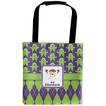 The center focal point of the design is a white square label outlined in the coordinating green and purple colors with our cute little girl in the middle. Add your little girl's name to make this design extra special.