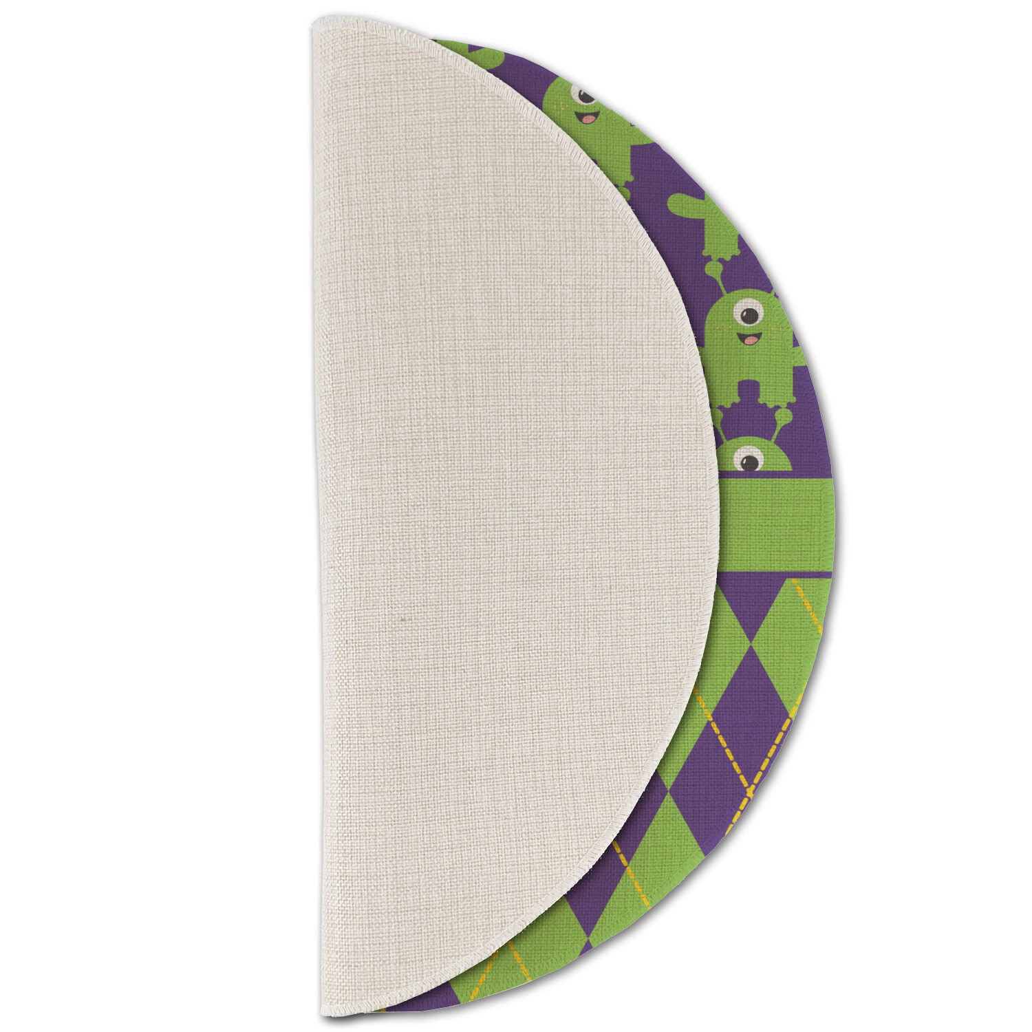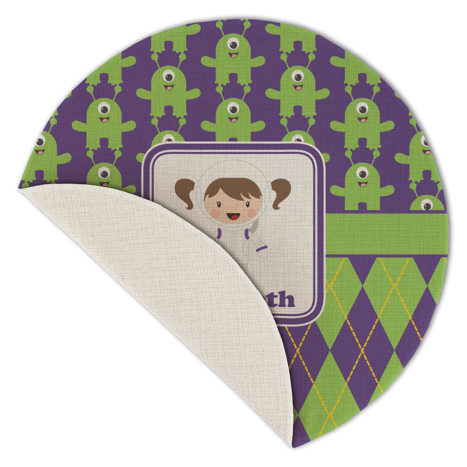 Not all martians have to be scary. These adorable green, one eyed martians will make any little girl a space fan. These little green martians come to life up against these beautiful purple background. The bottom of the design is a timeless green and purple argyle pattern with yellow accents. A green band with a purple trim brings both patterns together.