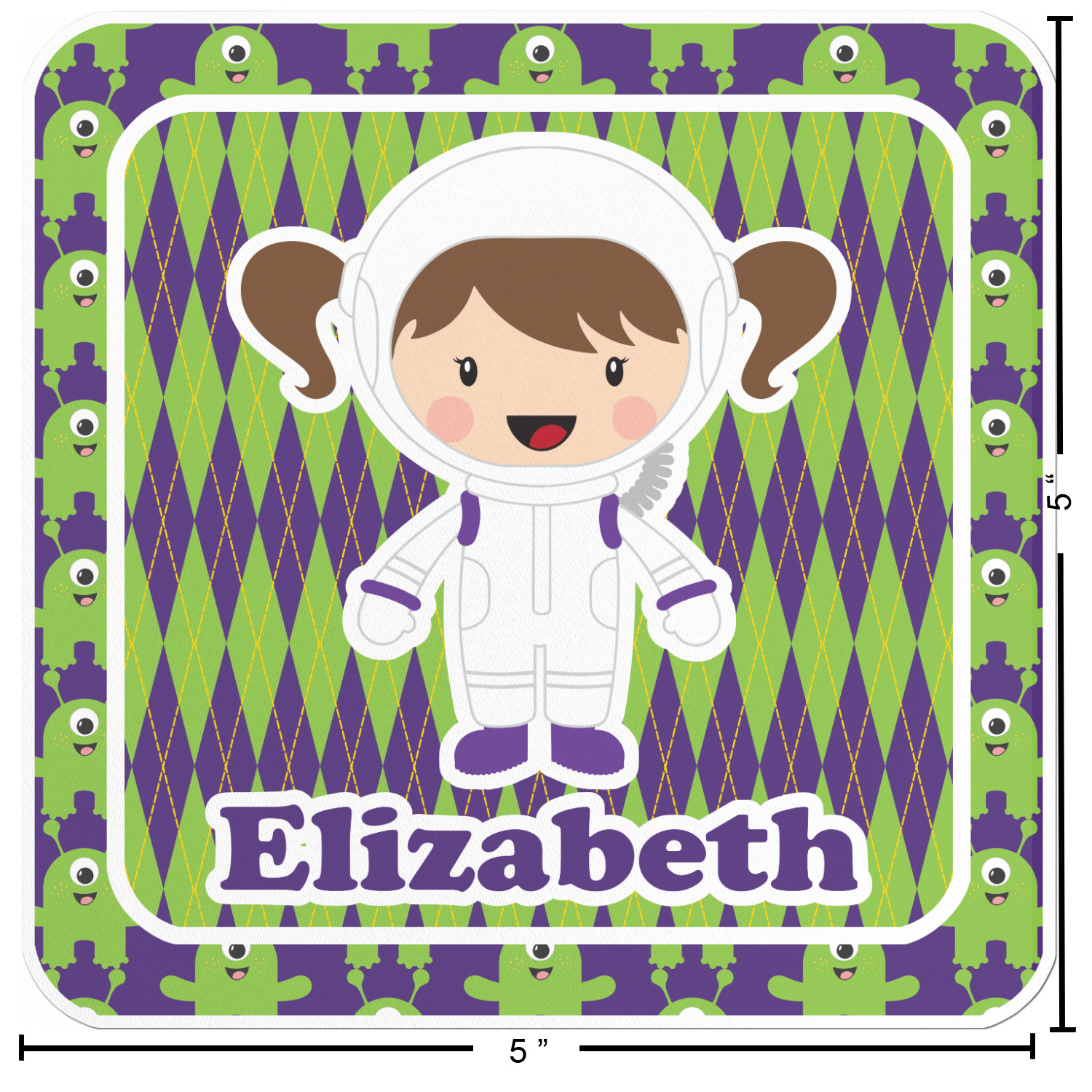 The center focal point of the design is a white square label outlined in the coordinating green and purple colors with our cute little girl in the middle. Add your little girl's name to make this design extra special.