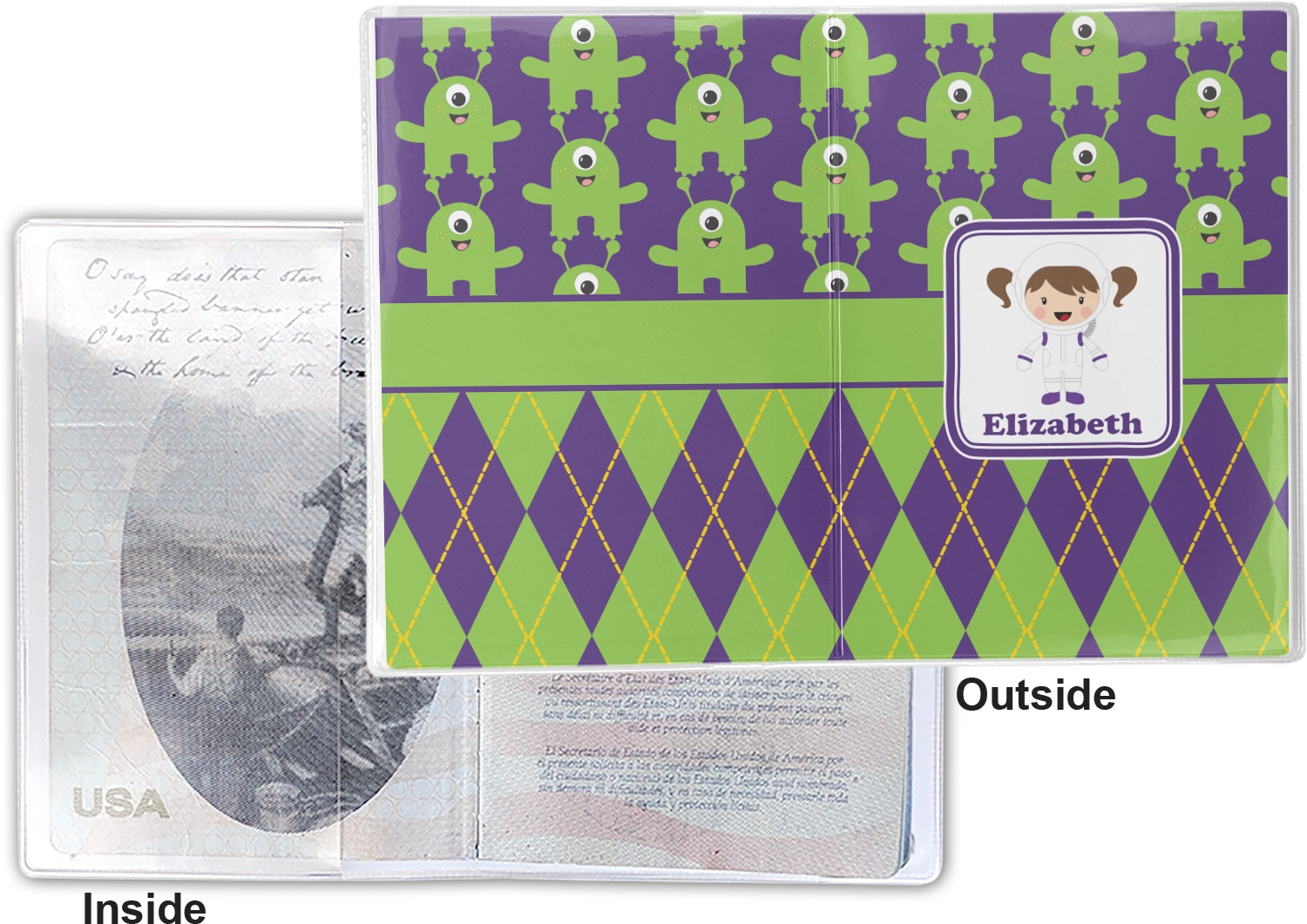 This cover is made of a sturdy clear vinyl with a personalized vinyl insert inside. There is a large and a small pocket on either side to hold the covers of your passport easily and firmly. The passport holder is approximately 7.5" x 5.25", the perfect size to snugly fit your passport. This slim cover is the perfect way to protect your passport without being one more bulky item you have to carry.