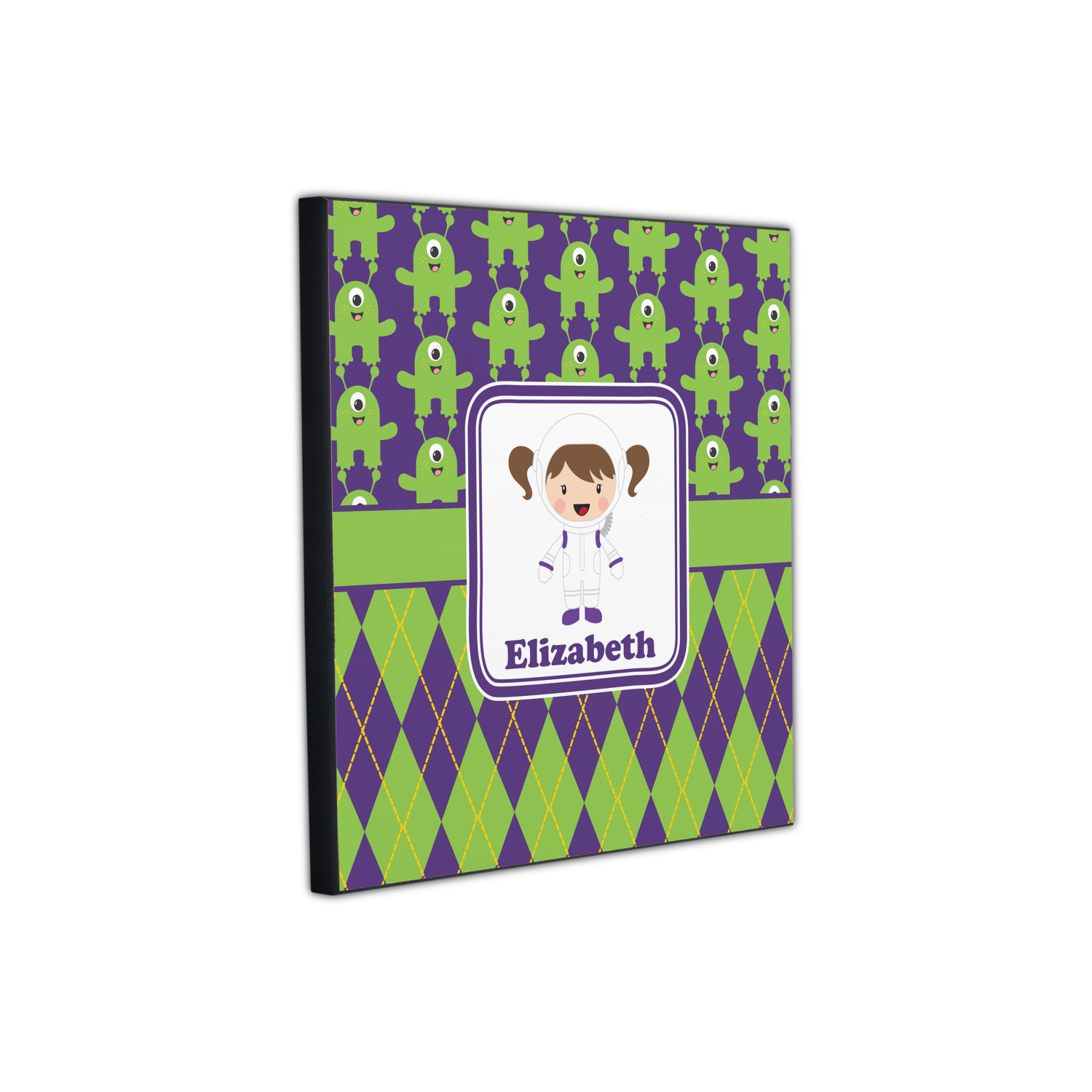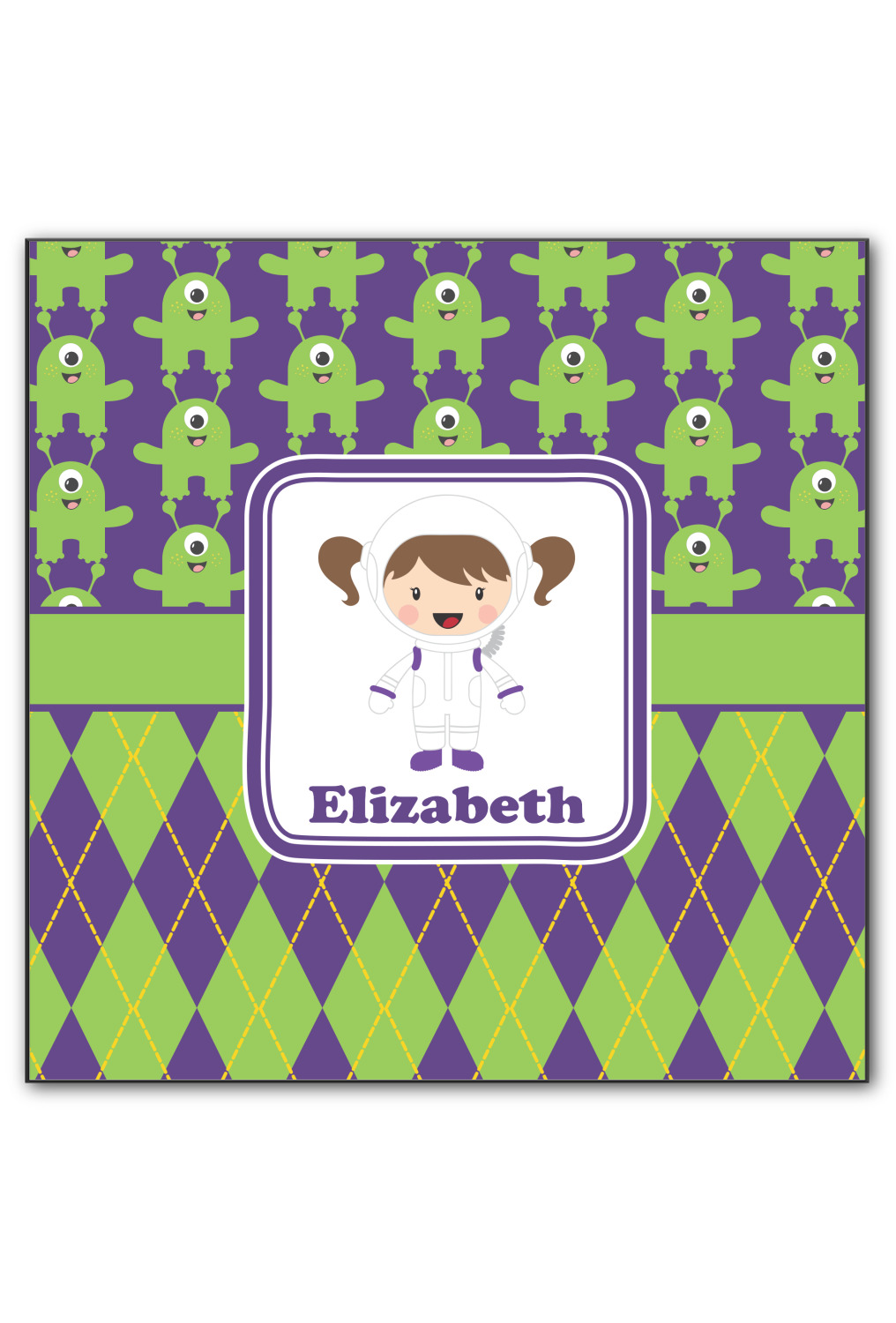 The center focal point of the design is a white square label outlined in the coordinating green and purple colors with our cute little girl in the middle. Add your little girl's name to make this design extra special.