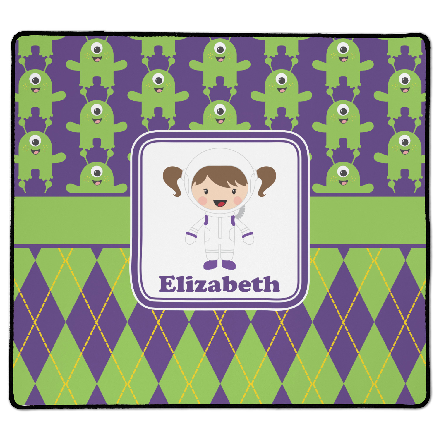 Not all martians have to be scary. These adorable green, one eyed martians will make any little girl a space fan. These little green martians come to life up against these beautiful purple background. The bottom of the design is a timeless green and purple argyle pattern with yellow accents. A green band with a purple trim brings both patterns together.