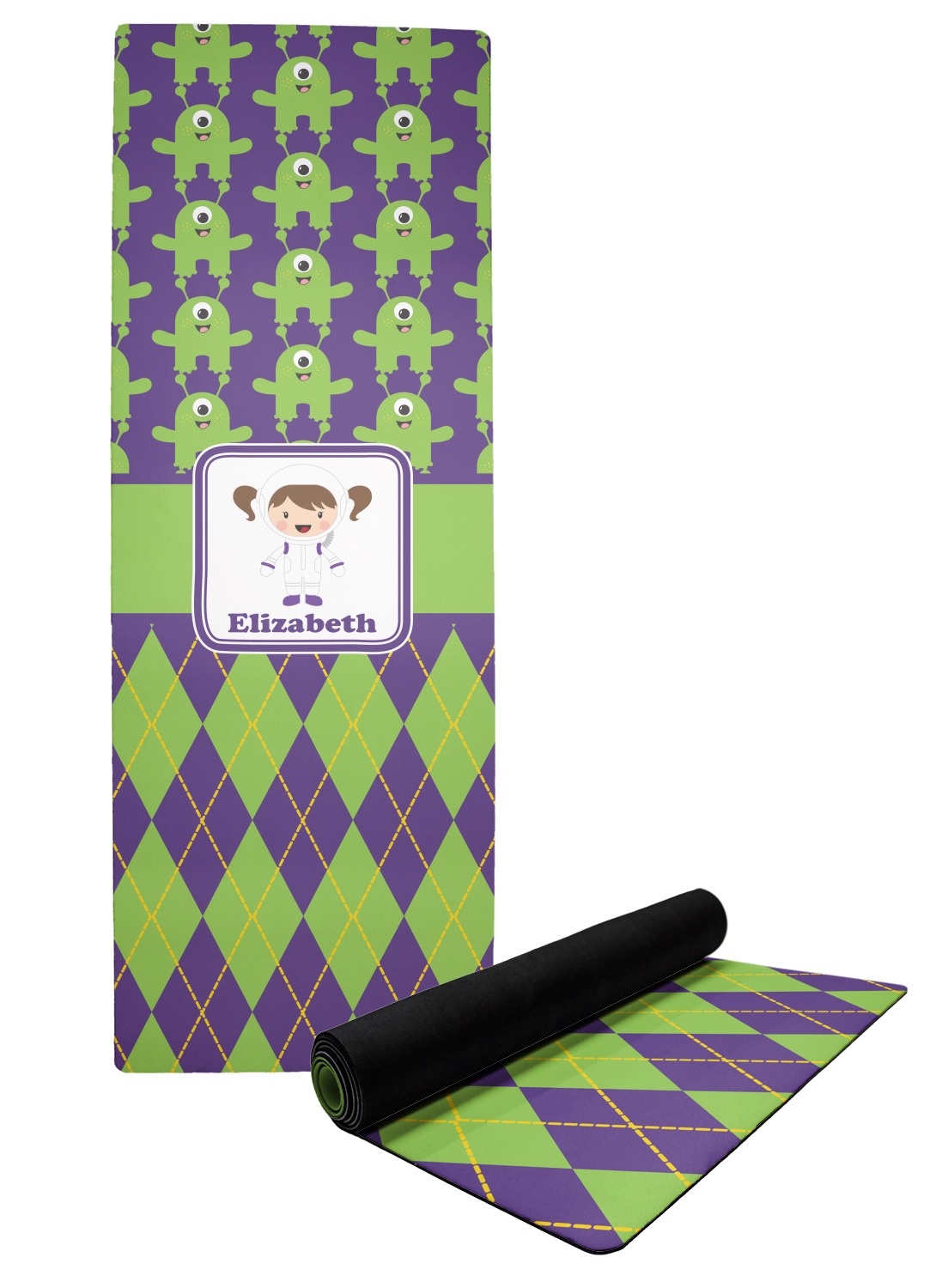 The top of the mats are dyed with your design using eco friendly non solvent inks. They have a smooth fleece felt top and feels very soft. The back of the mat is a sleek black and is a squishy non-slip texture to ensure that your mat does not slip on the floor. Our rubber backed mats are the perfect size at 68" x 24" and are just under approximately 1/4 inch thickness.