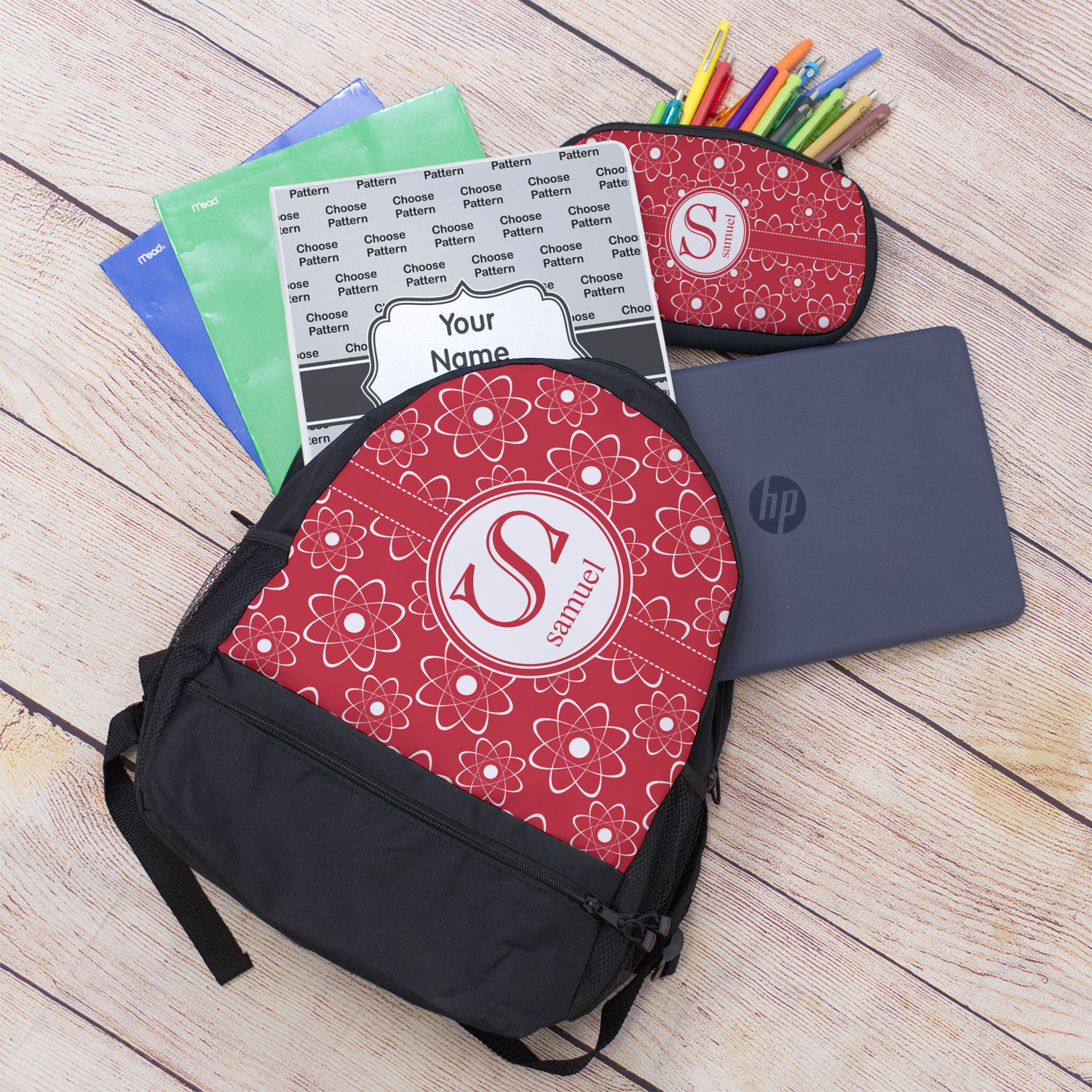 IF you can properly identify all the separate components of the atom.......you are worthy to add your name and initial for that special touch. If not, you can still add your name and initial. (There are protons, neutrons, and electrons in an atom.)