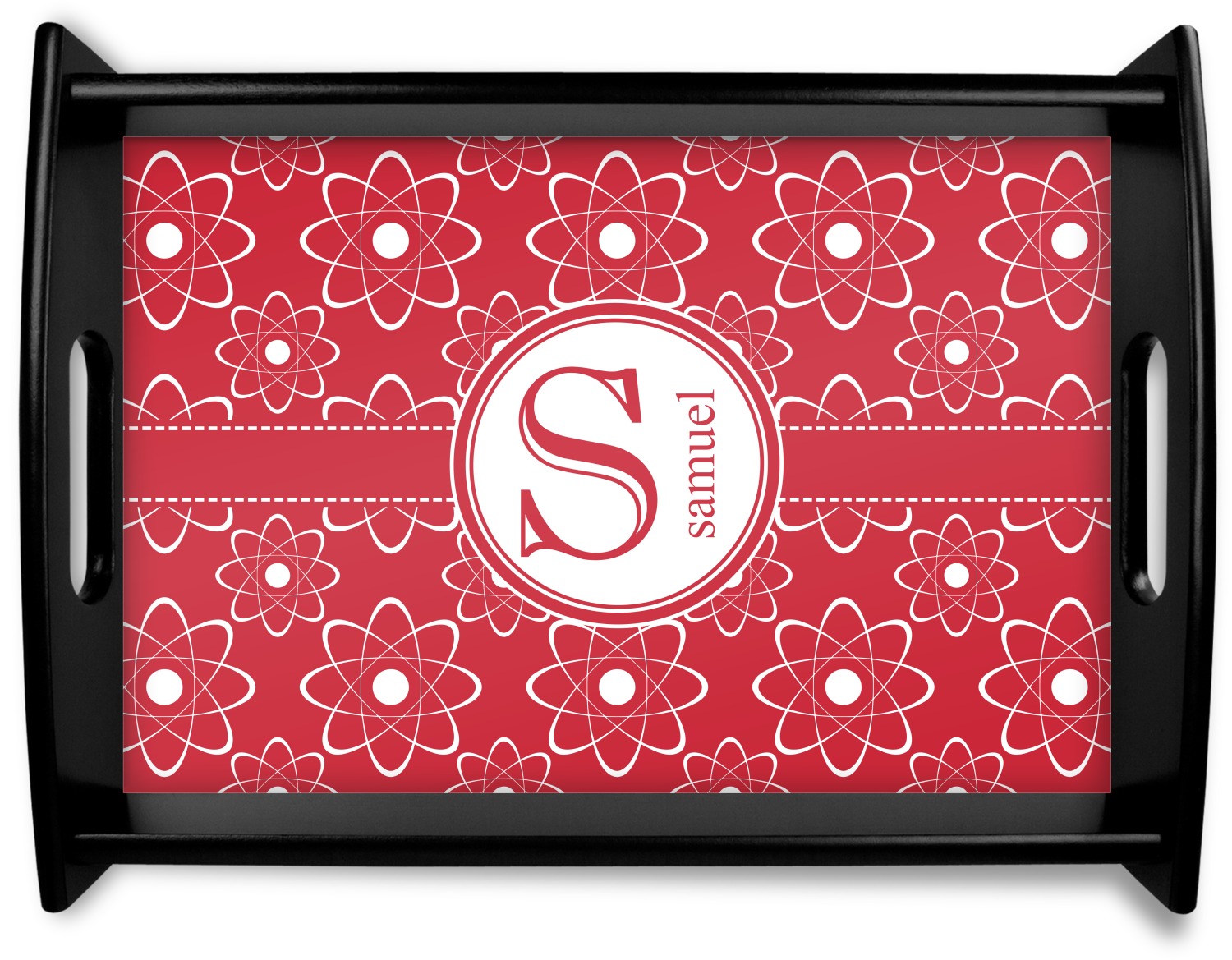 This serving tray with handles features square edges and two rounded sides, creating a very modern look. Each side is fabricated from a beautifully cut, natural wood. The bottom of the interior of the tray displays your customized design in bright, vibrant color. The tray is sold in both a black color and a natural wood look. Each variation of the wood serving tray has two sizes: Small, which is 14" x 10" x 2.25", and Large, which is 19.5" x 13.5" x 2.75".