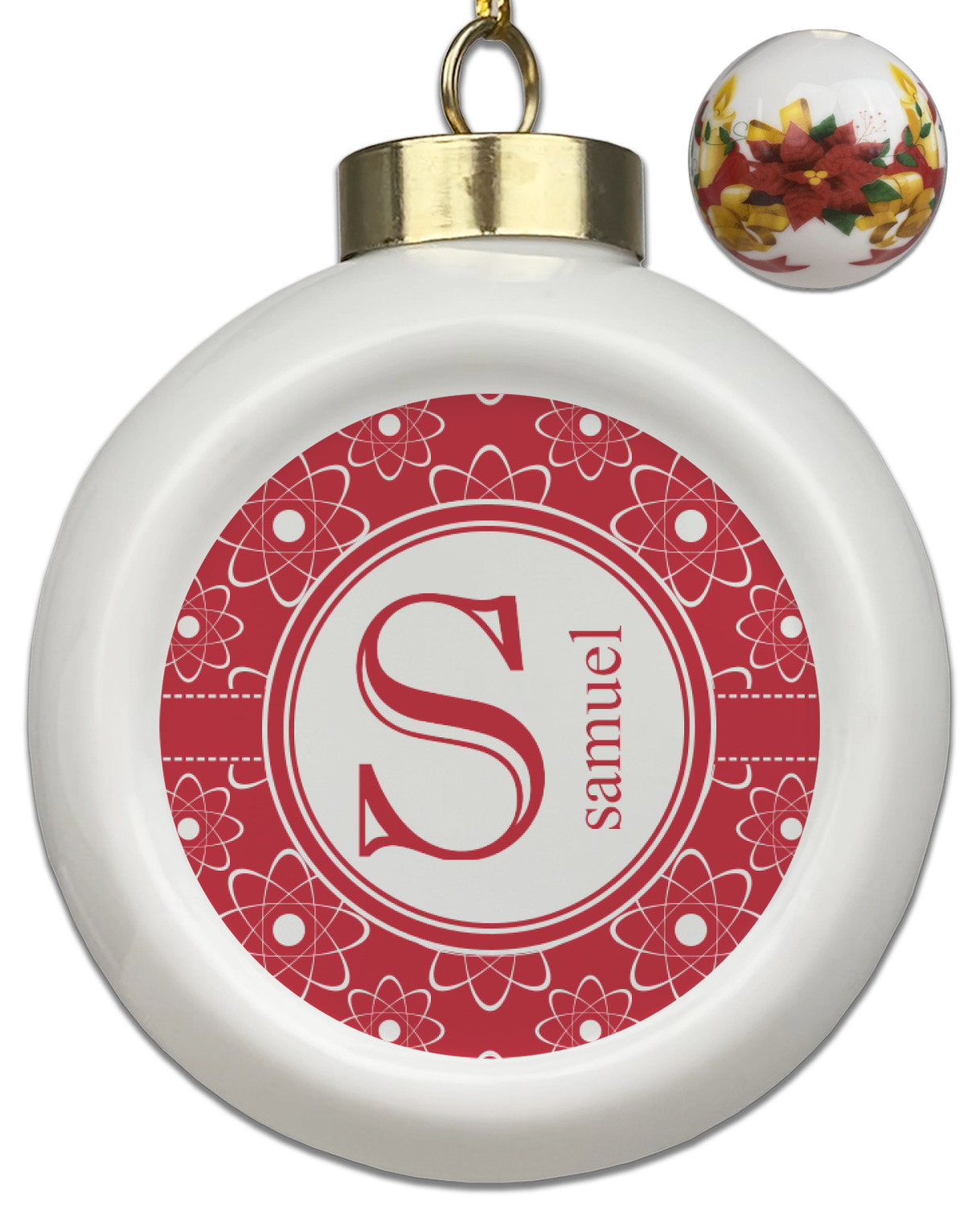 Our Christmas ornaments are a unique ceramic ball shape with a twist as it has a flat face to display your custom design! Select from one of our two design types - Christmas Tree or Poinsettia Garland - to adorn the curved back of your personal design. Each ornament measures 3H x 2.5W x 2D accompanied with a gold string accent for finishing touches to hang on your beautiful Christmas tree!