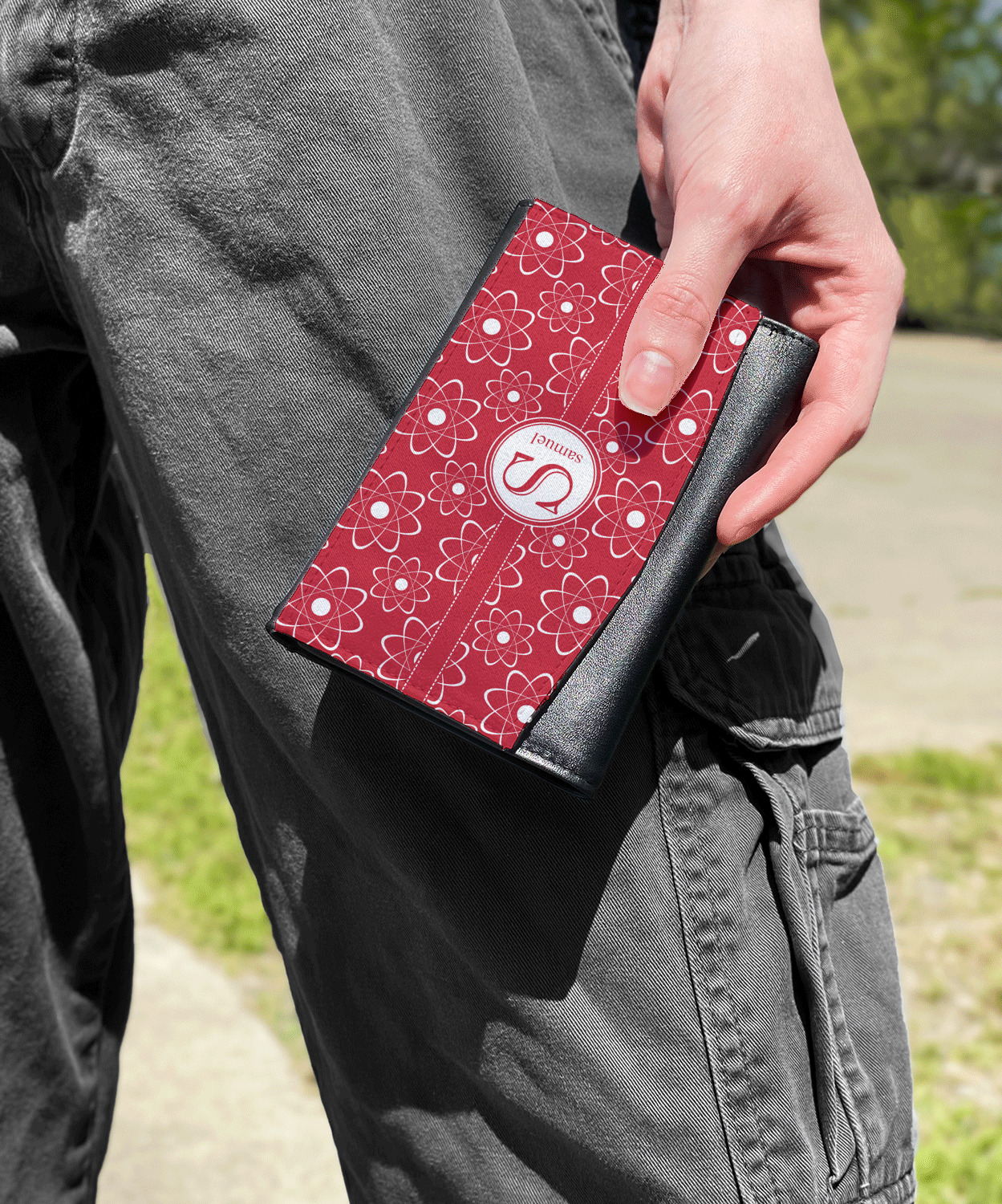 The compact size of this wallet - 5.5in wide, 3.5in tall and 0.75in thick when folded - makes it perfect to hold in hand and small enough to fit in a clutch or a normal size purse. The outside flap is customized with your choice of artwork and closes with a snap closure - with two different snaps to allow it to be adjusted when storing more items - to securely fasten the flap.