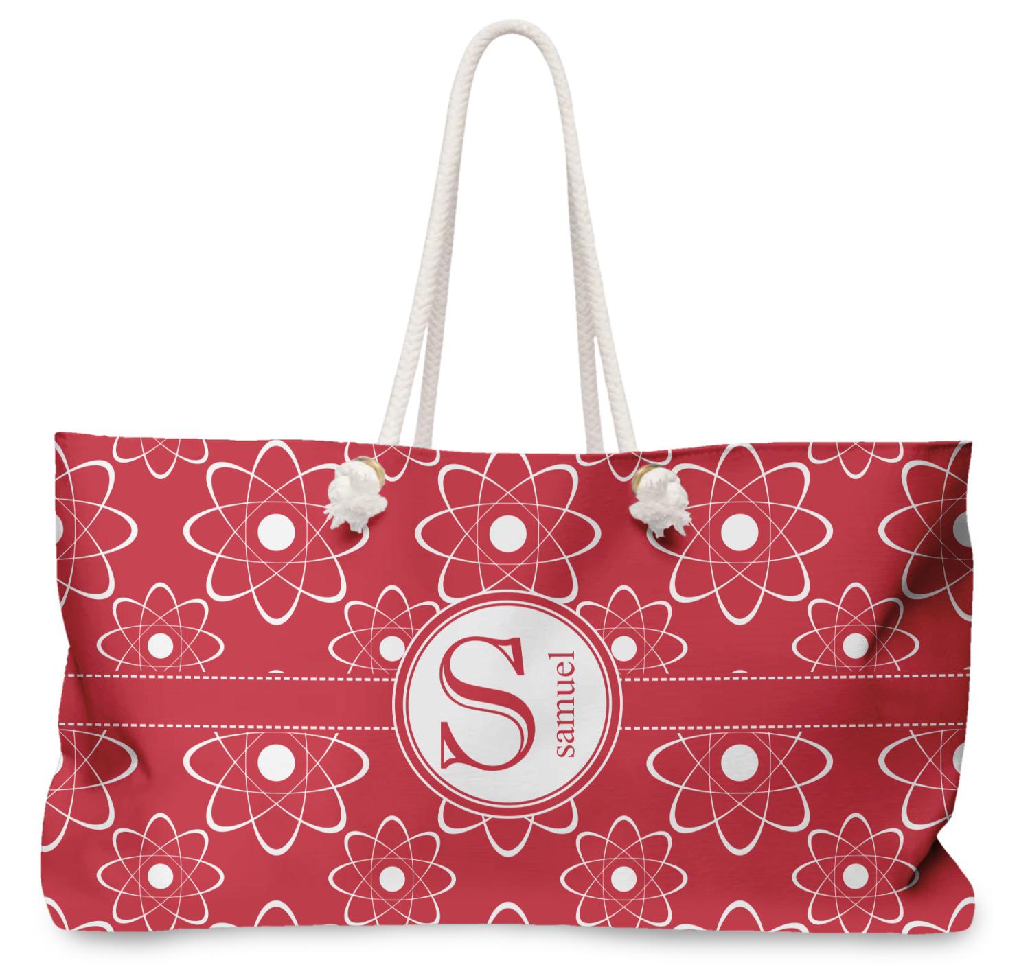Our oversized weekender tote with rope handles is perfect for your weekend at the beach or on the town. This large tote are 24" W X 13" H, with a 5" gusset and a 27" thick rope handles with a knot that is put through a grommeted brass hole.