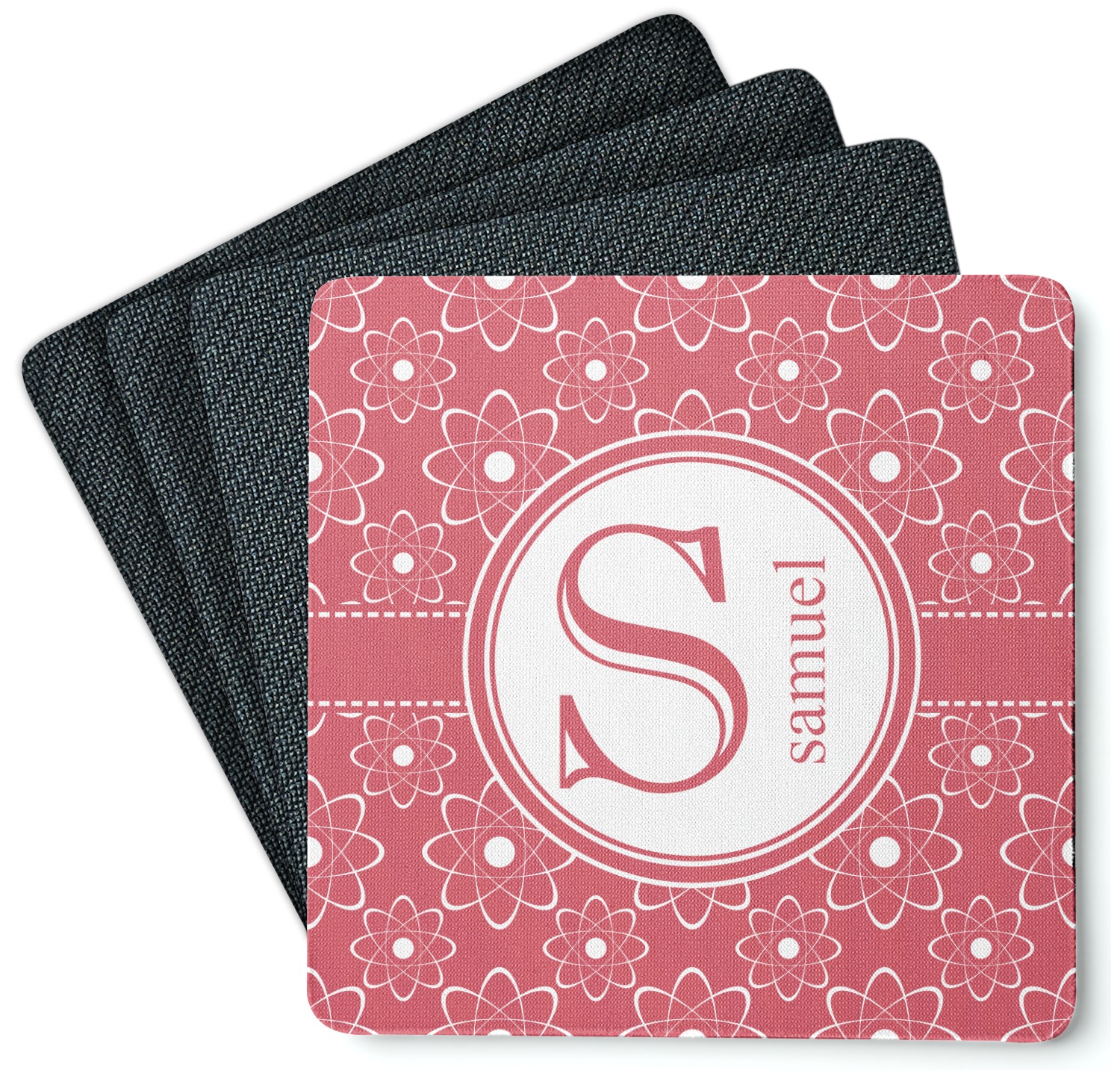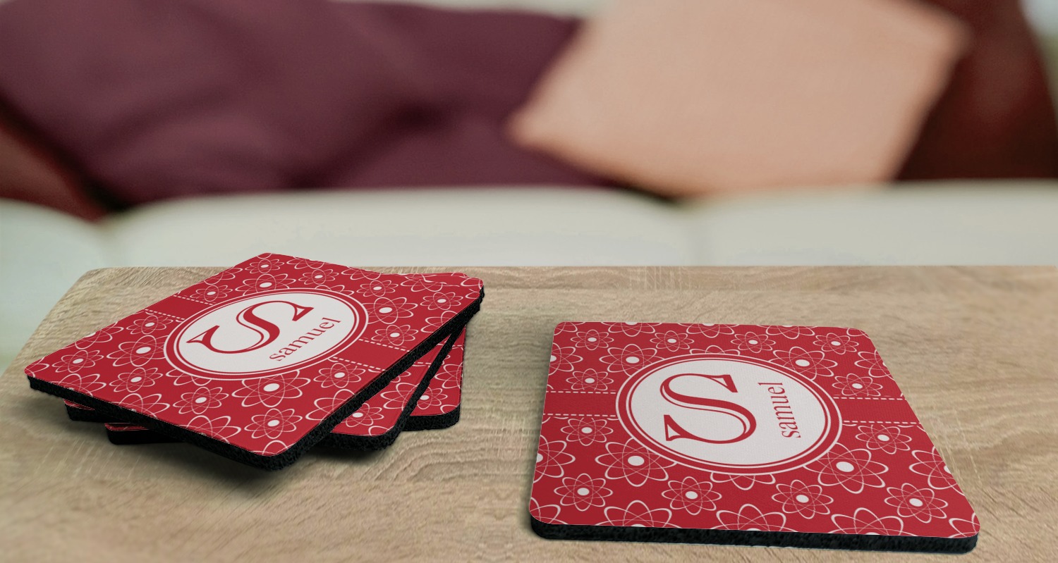 These drink coasters have a smooth, polyester top and a textured, rubber backing on its bottom. The non-slip rubber backing underneath works to keep any spills at bay. At 4 by 4 by 0.25 inches thick, these custom coasters are a suitable size for most drinkware. Your personalization is displayed atop the face of the cup coaster. We sell these rubber coasters in two different shapes: square and round. You can buy each shape as singulars or as a set of 4.