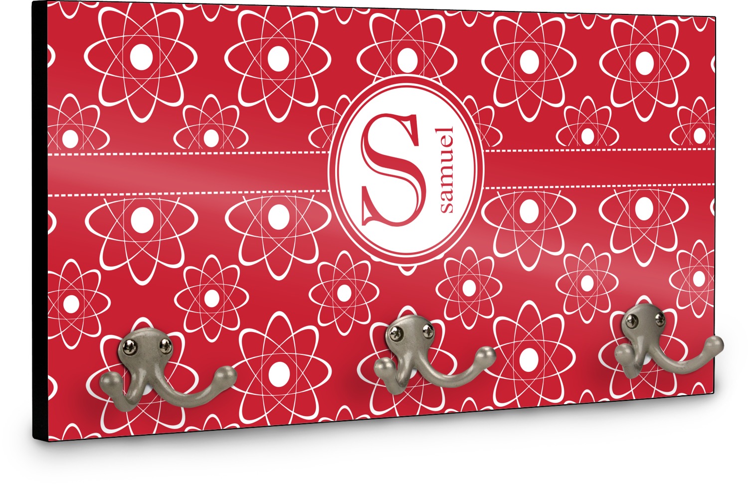 This coat rack is the perfect way to add some personality to your wall or entryway. The board is made of a strong maple that is approximately 16" x 8". The three 2-prong hooks are a sturdy metal that have three screws attaching them to the board. Your design is printed right onto the front of the board while the back and sides are a simple black.