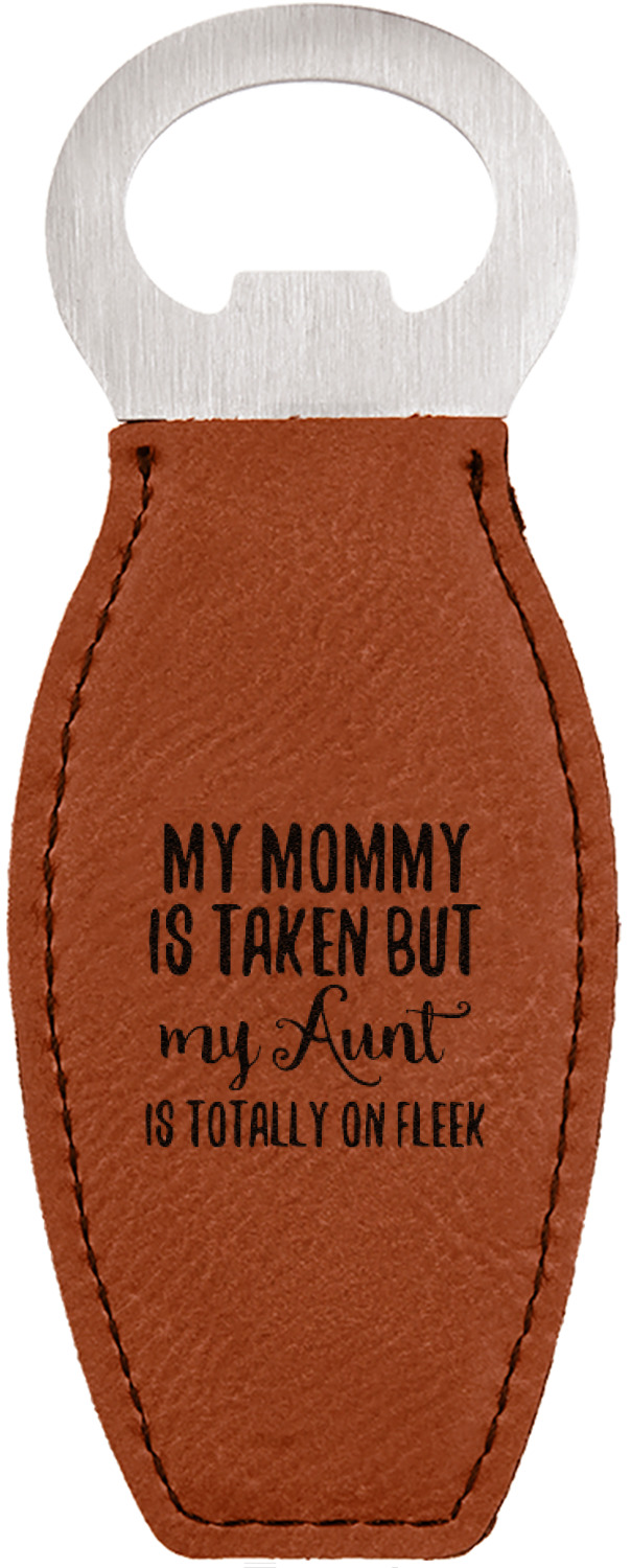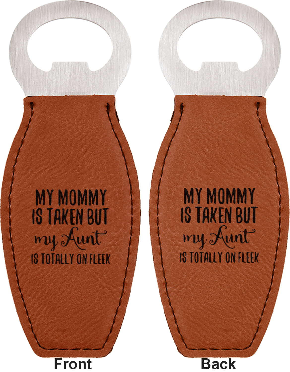 Built from stainless steel, these custom bottle openers are wrapped in a cognac-colored leatherette. Sharp, black stitching lines the edges for extra durability and a finished touch. Your personalization is laser-engraved onto the surface of this leatherette, leaving behind a crisp, black coloration. At 4.6 by 1.8 inches, this beer bottle opener gives you much of leverage when trying to open a stubborn bottle. On the opposite end of the opener, you'll find a magnet that you can use to display your new, unique bottle opener!