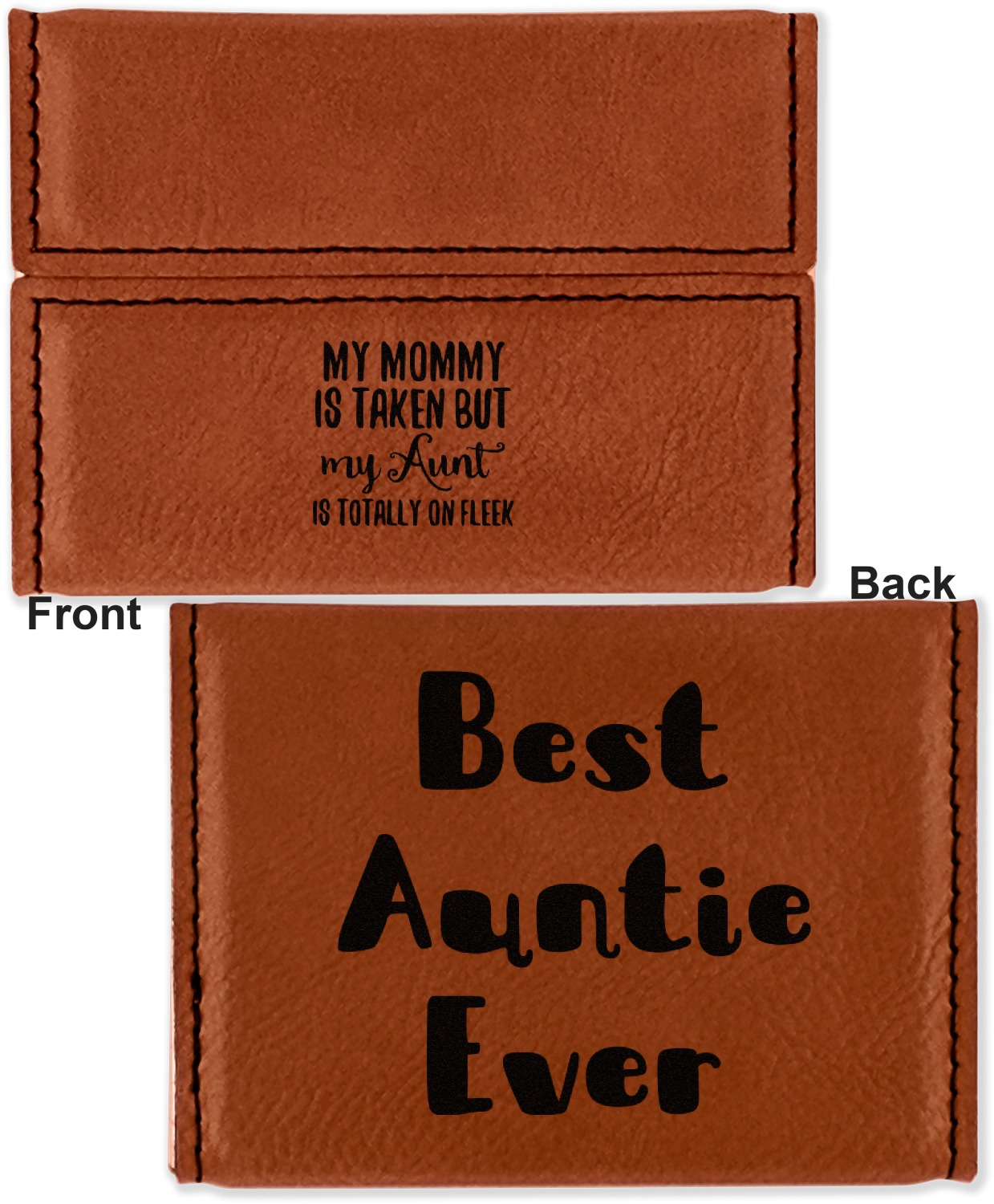 Your personalized design is laser engraved onto either the front, or the front and back of the card holder, depending on the model you purchase. Once engraved, the design will appear a darkened black against the cognac color of the leatherette.