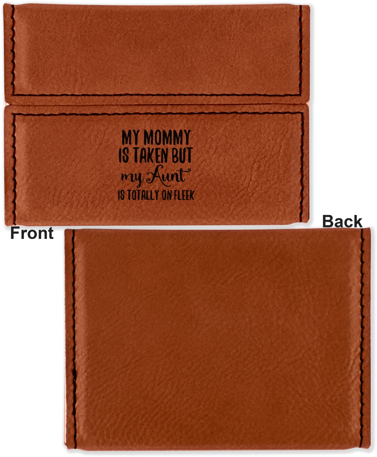 Your personalized design is laser engraved onto either the front, or the front and back of the card holder, depending on the model you purchase. Once engraved, the design will appear a darkened black against the cognac color of the leatherette.