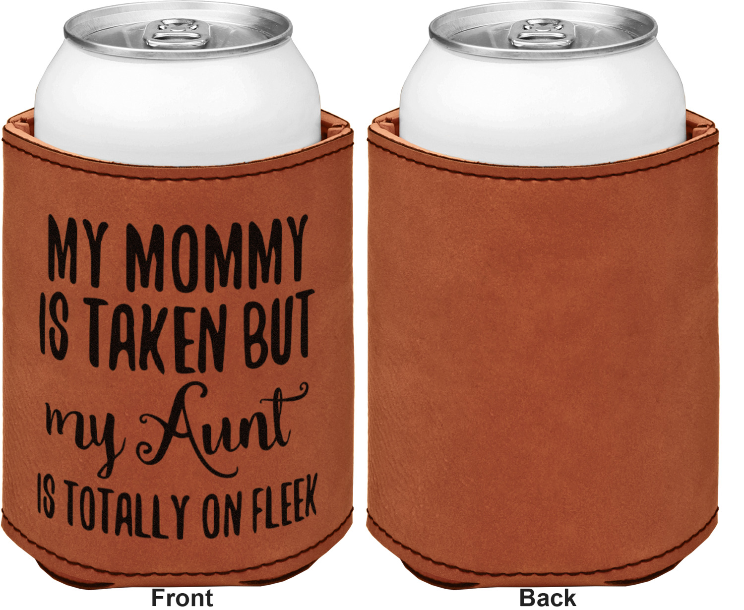 This can sleeve is made from a cognac-brown leatherette and stitched with a sturdy, black thread. A slim padding lines the inside of your can sleeve to allow for a better fit once your drink is inserted. The sleeve itself measures at 4 by 4.5 inches, allowing this custom can sleeve to accommodate most canned drinks. Your personalized design can be engraved on the front and back, or solely the front. When laser-engraved, your design appears as a black coloration which contrasts the leatherette nicely.