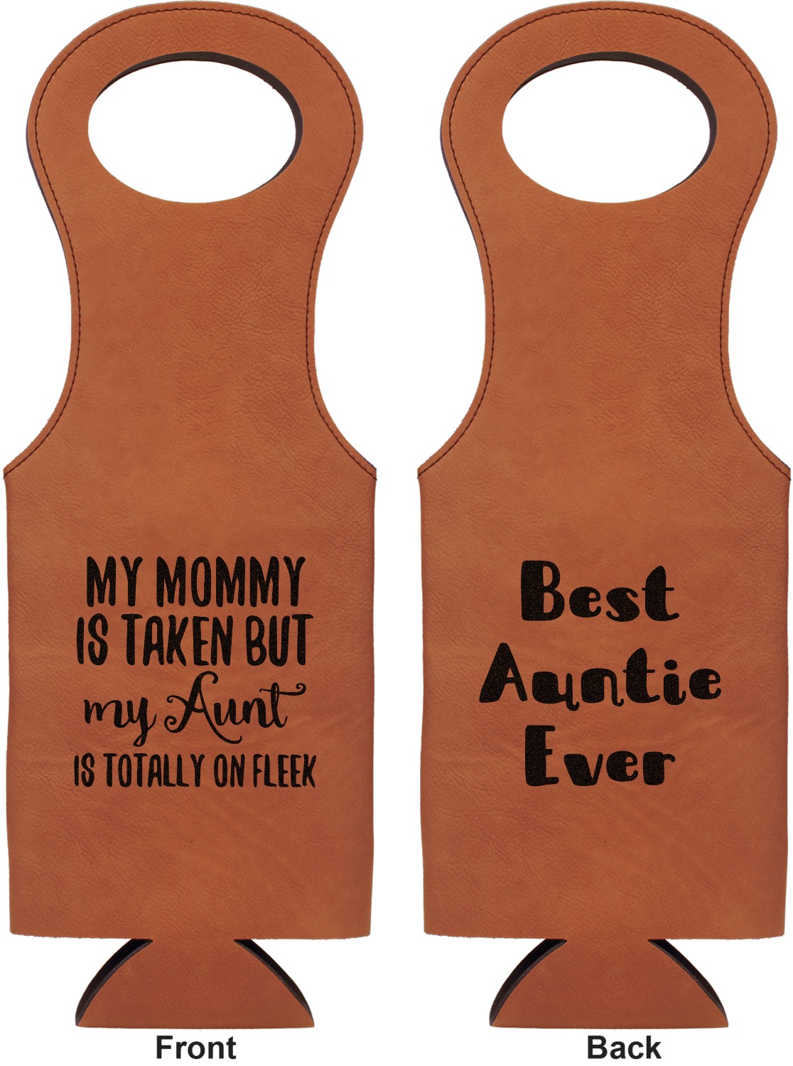 This wine carrier is made from a stunning leatherette, in a cognac-brown color. Strong, black stitching lines the sides of your wine bottle bag and provides extra durability. The interior is lined with a padded, black material to allow for a snug fit once your bottle is placed inside. At the top of this wine gift bag, you'll find two oval shaped handles that elegantly complements the rest of the bag's style. We provide you with the option of laser-engraving the front, or the front and back of your new personalized wine bag!