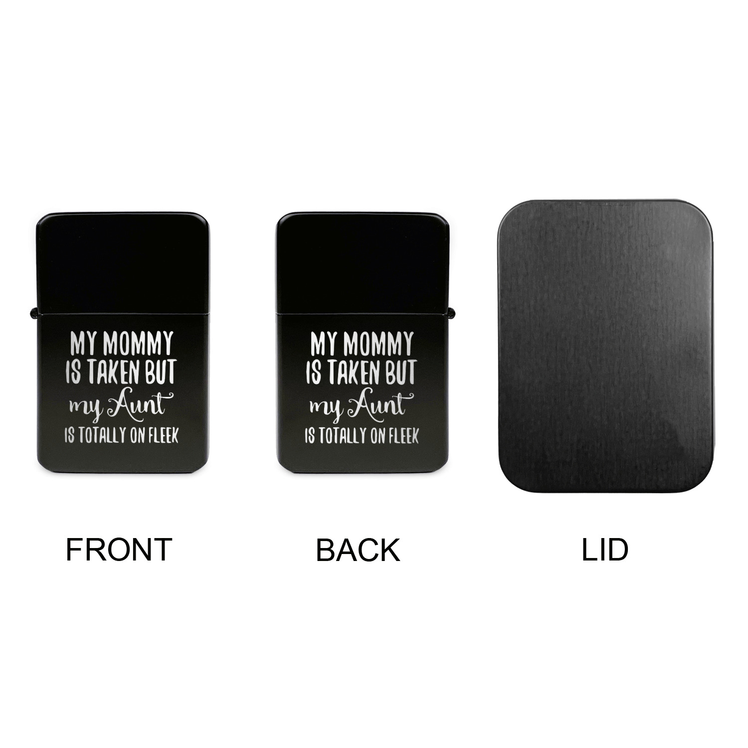Available in black or pink powdercoat, we then laser engrave on the front and back (optional) with your design. Additionally you also have the option of engraving the lid to the included black tin case if so desired.