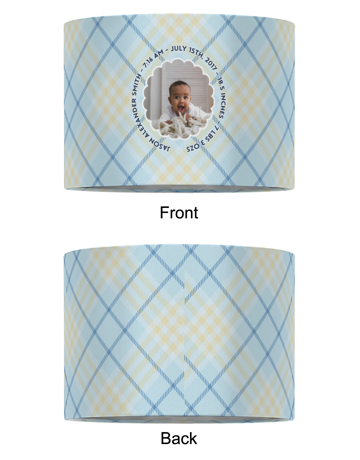 This design is for baby boys. The background is a baby blue plaid. In the middle of the design is a scalloped frame to upload your baby's picture into (make sure it is high quality!). Surrounding the frame is where your personalization goes. Put their name, birthday, or whatever you like.